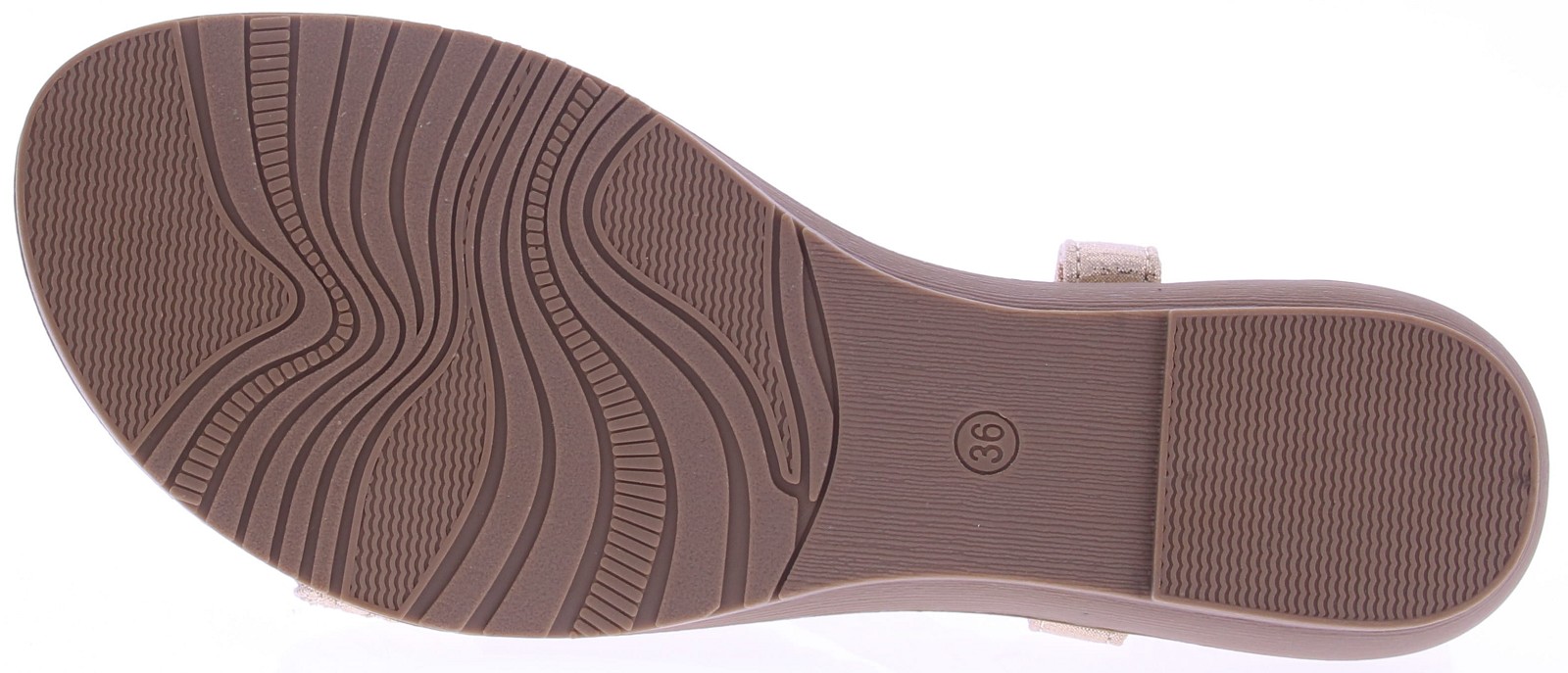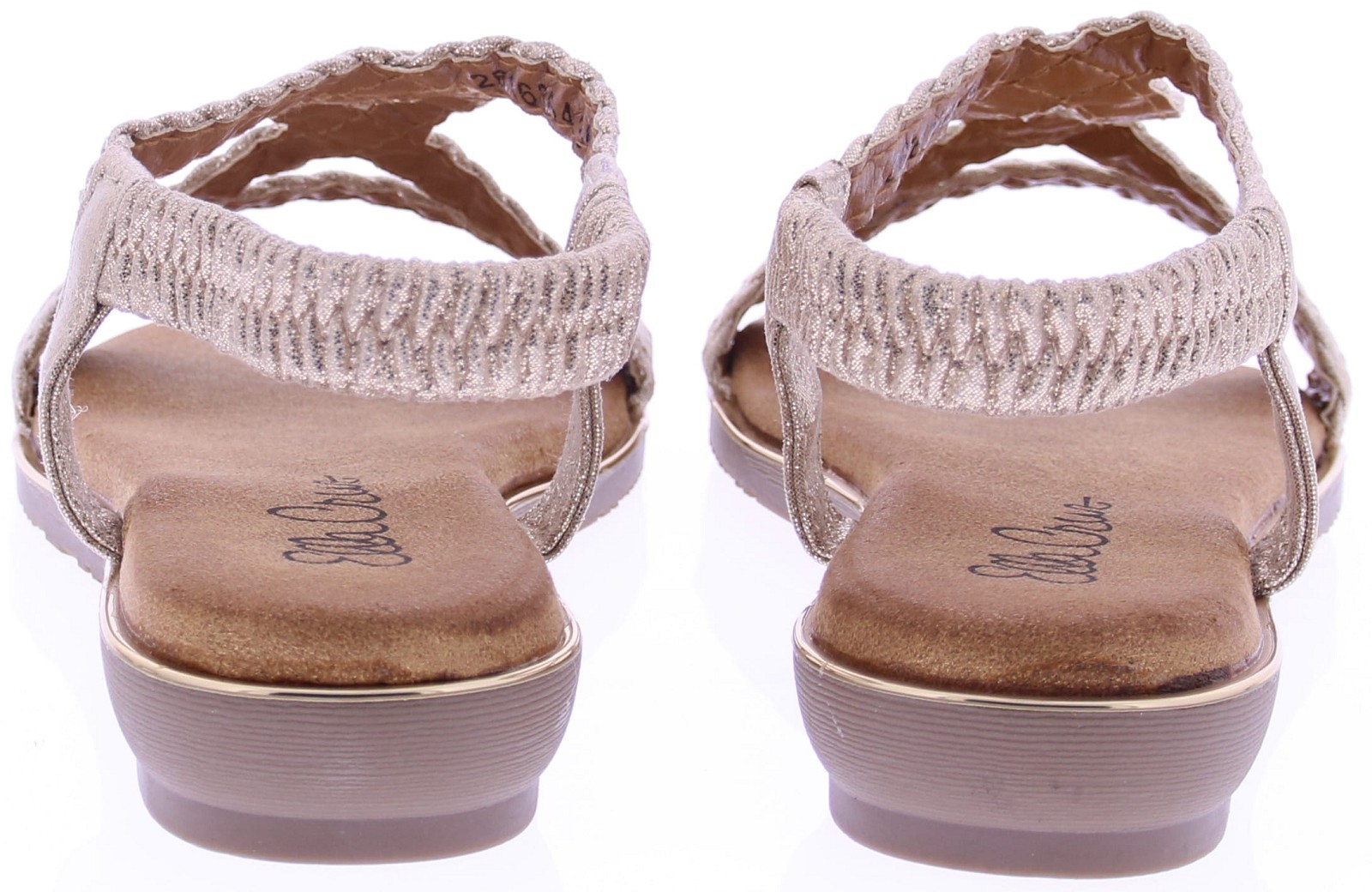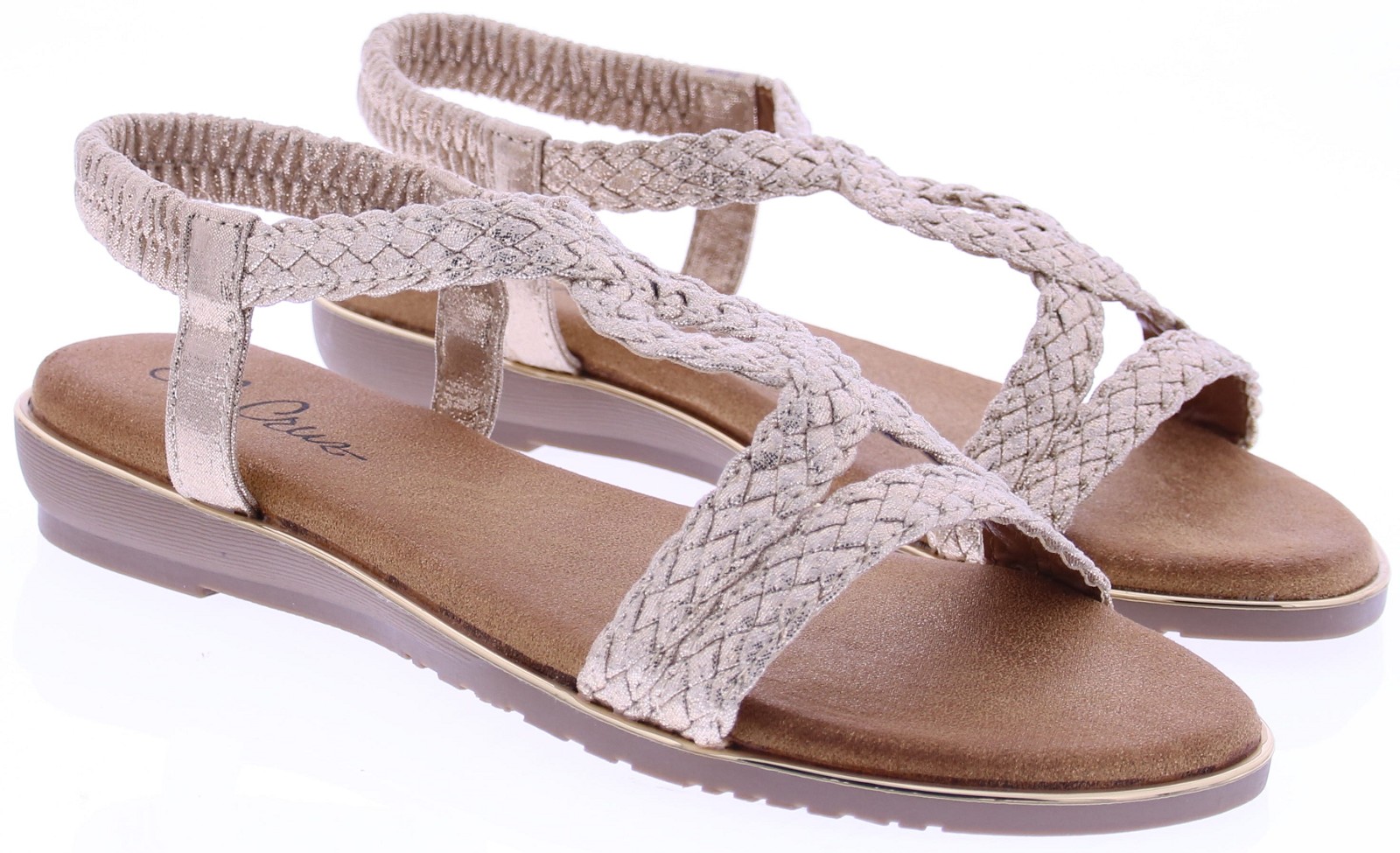 Gold-colored women's sandals from Ella Cruz, style Rhune. These sandals feature braided rope straps with a shimmering finish across the instep. The heel strap is elastic, making the sandals easy to slip on and snug around the foot. The footbed is softly finished for comfort, and the lightweight sole is smooth to walk on. A summery and versatile style that pairs beautifully with both airy trousers and a dress. Discover other women's sandals from Ella Cruz at Klijsen.