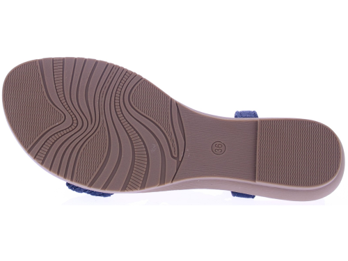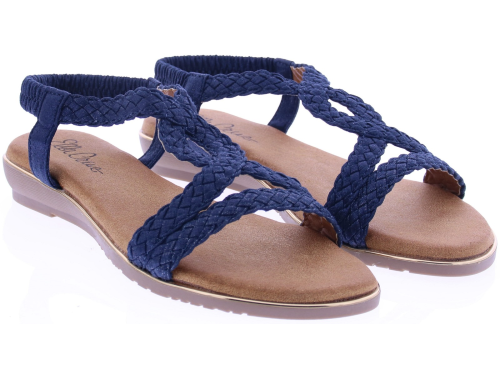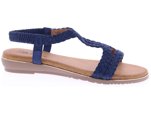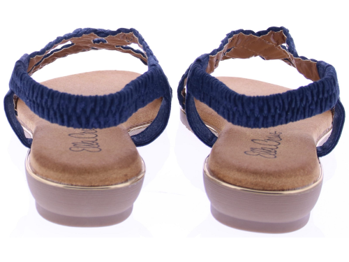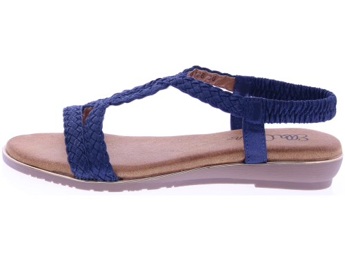Dark blue women's sandals from Ella Cruz, style Rhune. These sandals feature braided rope straps with a shiny finish across the instep. The heel strap is elastic, making the sandals easy to slip on and snug around the foot. The footbed is softly finished for comfort, and the lightweight sole is smooth to walk on. A summery and versatile style that pairs beautifully with both airy trousers and a dress. Discover other women's sandals from Ella Cruz at Klijsen.