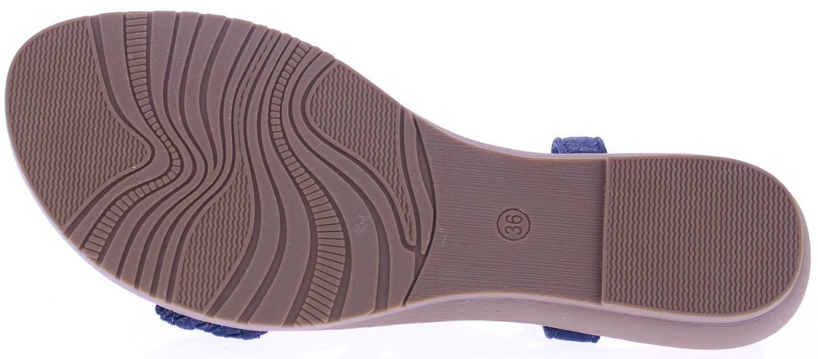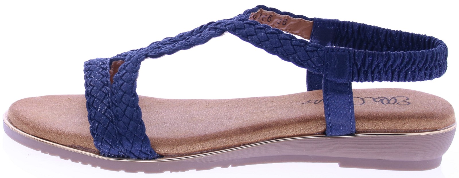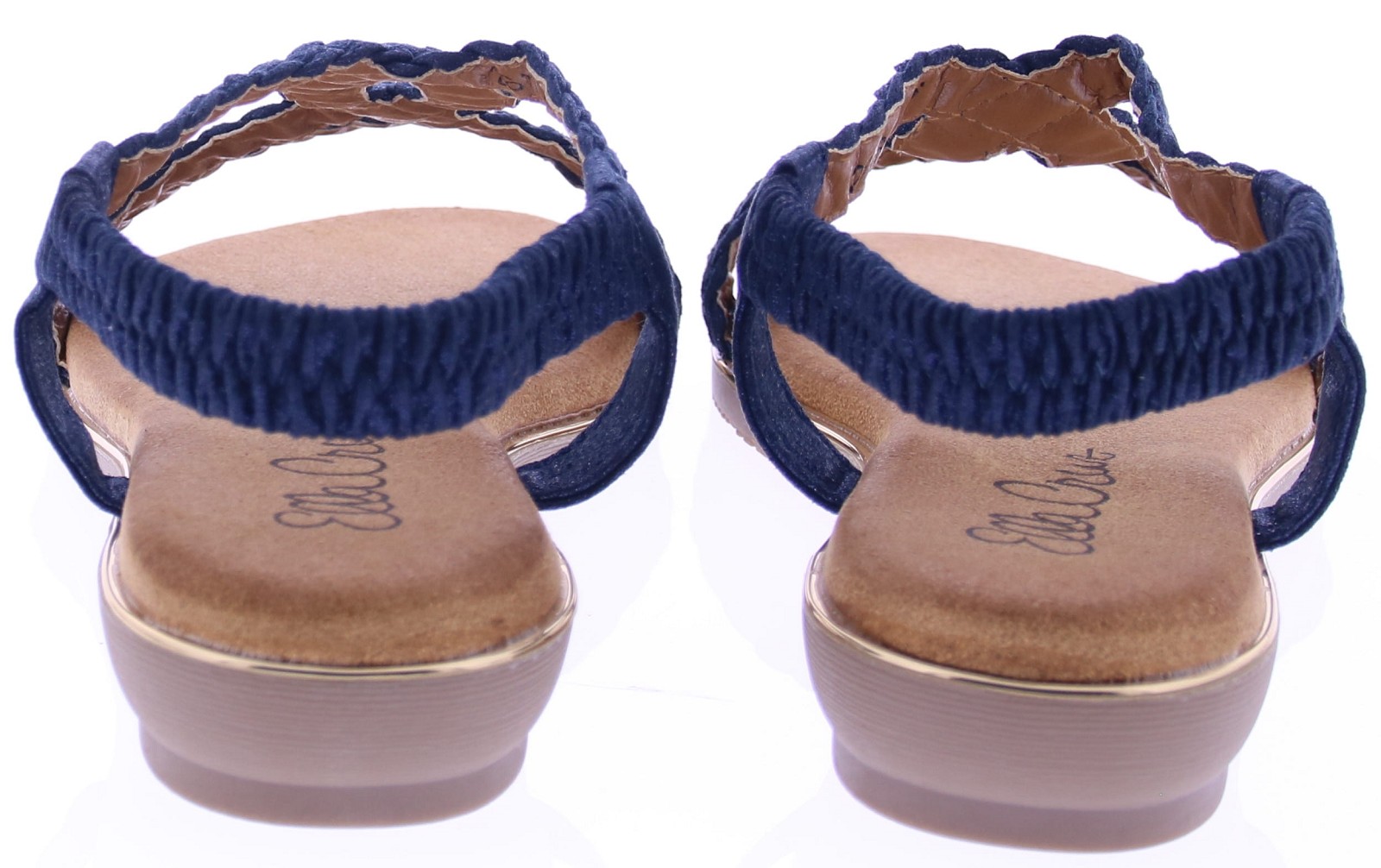 Dark blue women's sandals from Ella Cruz, style Rhune. These sandals feature braided rope straps with a shiny finish across the instep. The heel strap is elastic, making the sandals easy to slip on and snug around the foot. The footbed is softly finished for comfort, and the lightweight sole is smooth to walk on. A summery and versatile style that pairs beautifully with both airy trousers and a dress. Discover other women's sandals from Ella Cruz at Klijsen.