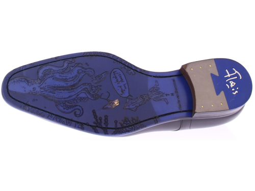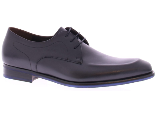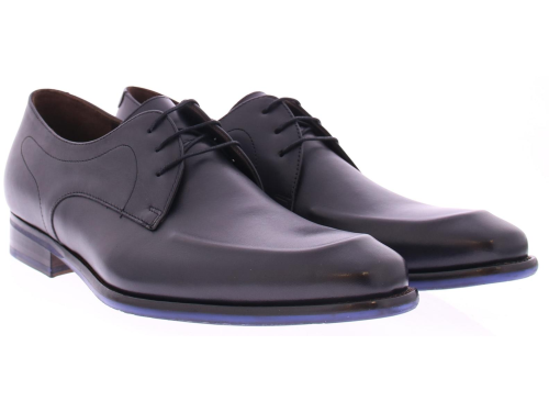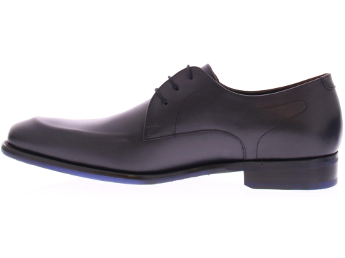 Men's lace-up shoe by Floris van Bommel made of dark grey calf leather. The vamp has a so-called lime mirror underlay. The shoe is leather lined and has a rubber sole with leather optic. The last is H.article: de stijler 37.02.