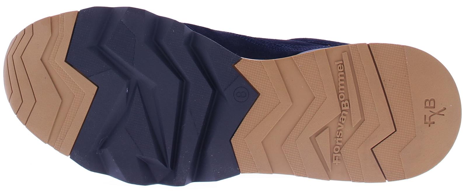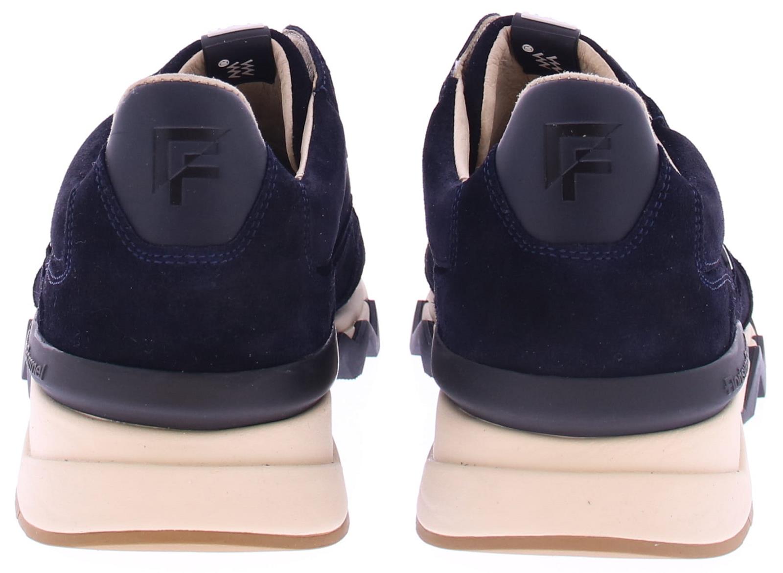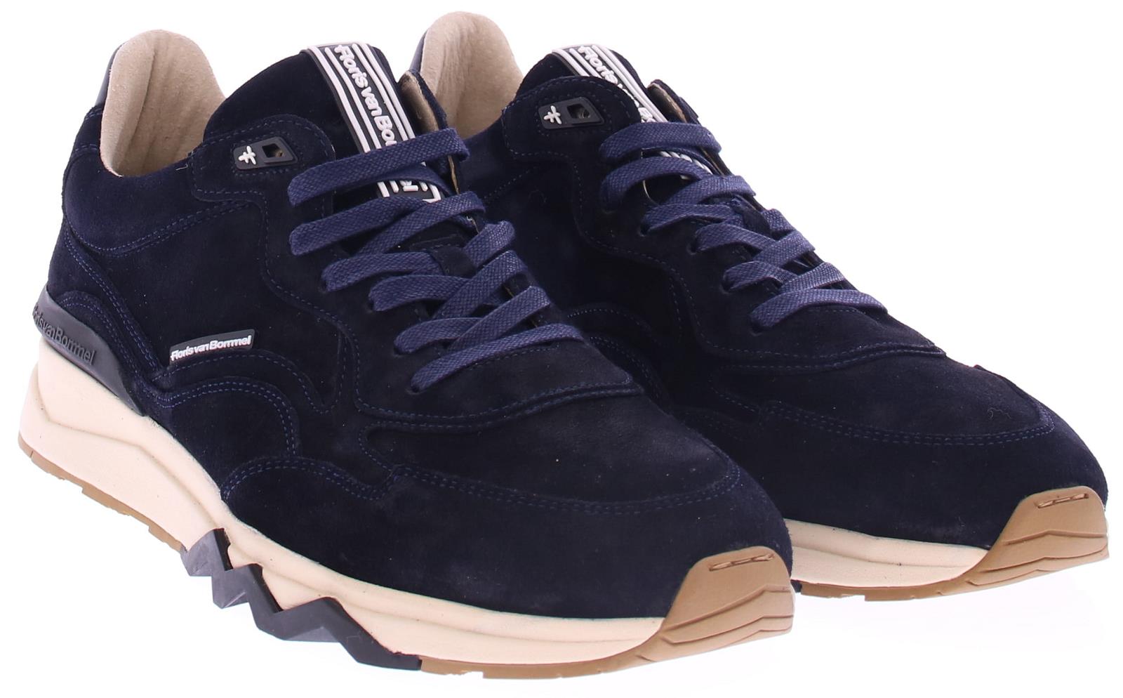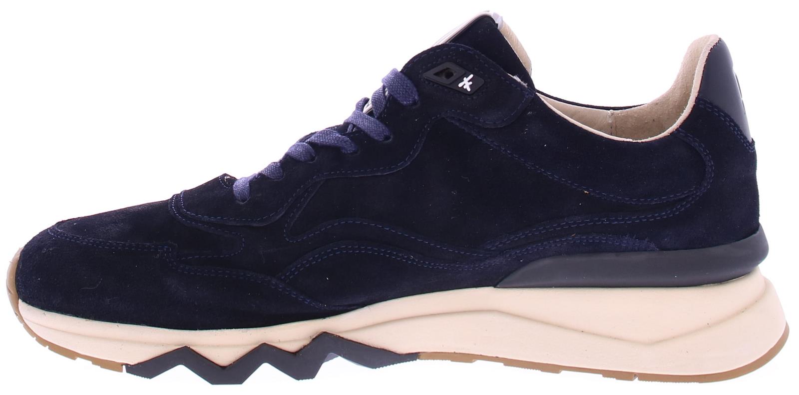 Dark blue suede men's sneaker by Floris van Bommel. DE ZAGER 02.03 This sneaker is made on a rubber sole. The tread is provided with a typical Floris van Bommel zigzag line. The shoe comes on a G1/2 last. The insole is removable and the lining is made of leather.