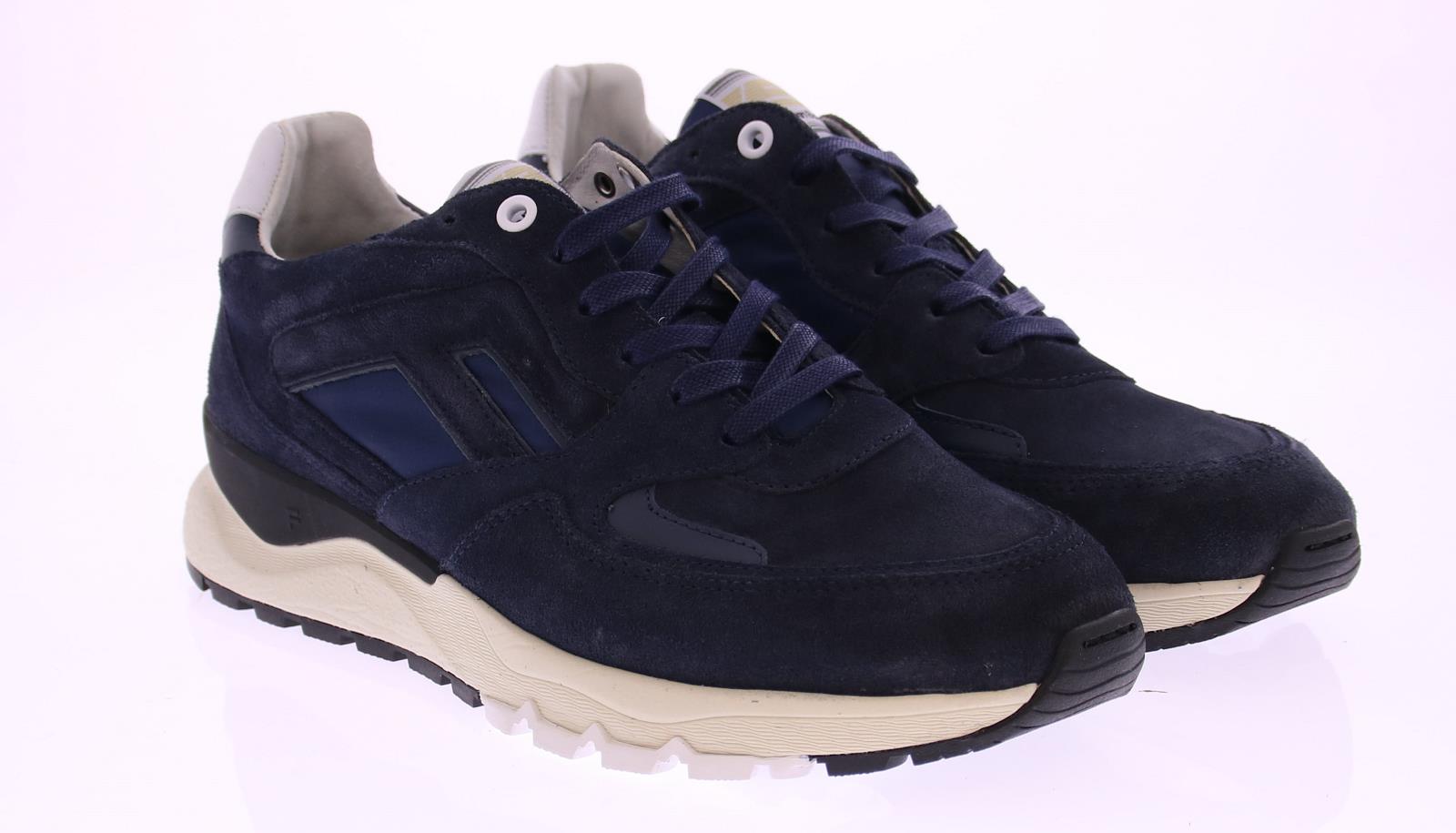 Men's sneaker by Floris van Bommel, item SFM-10154-41-01, model the Treener 01.12. This dark blue sneaker has a suede upper with fabric and leather. The midsole is dark blue, and the tread is black with white and rubber. The shoe has a full leather lining with a removable insole. The width of the last is G1/2.
