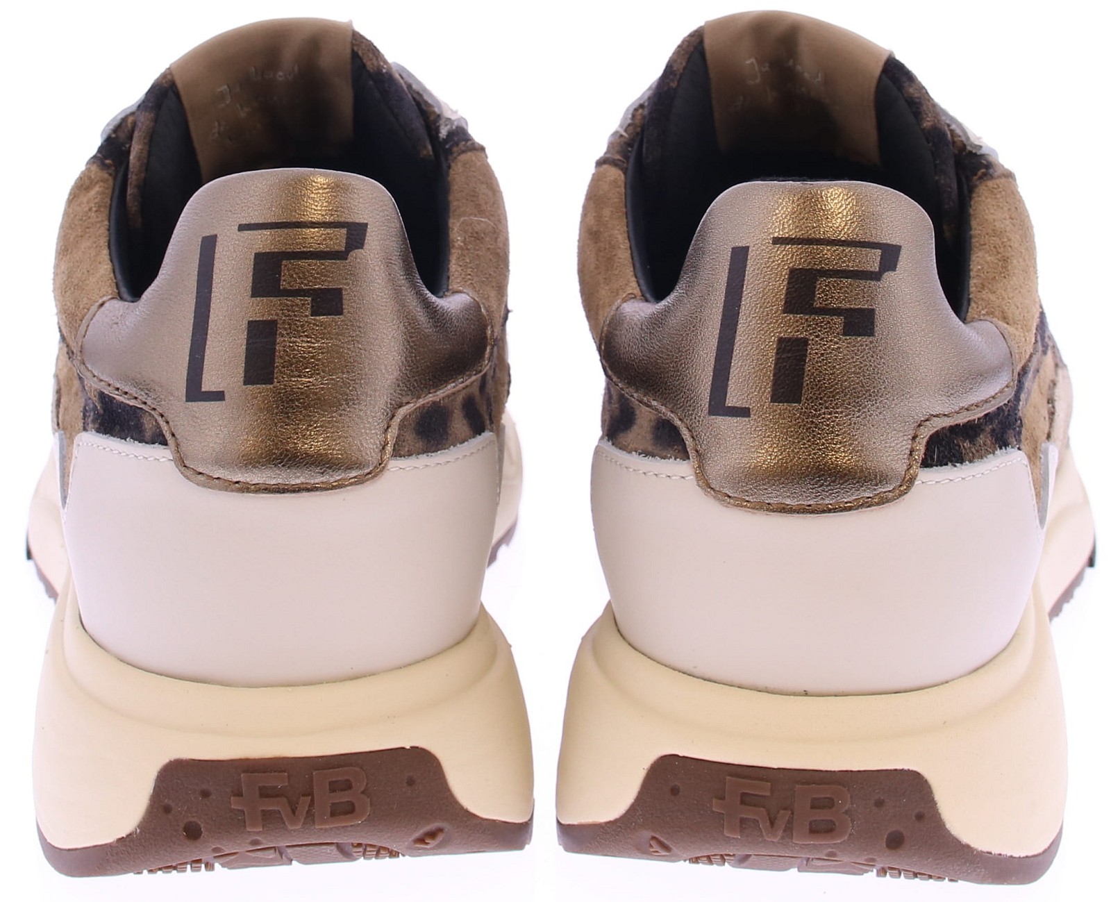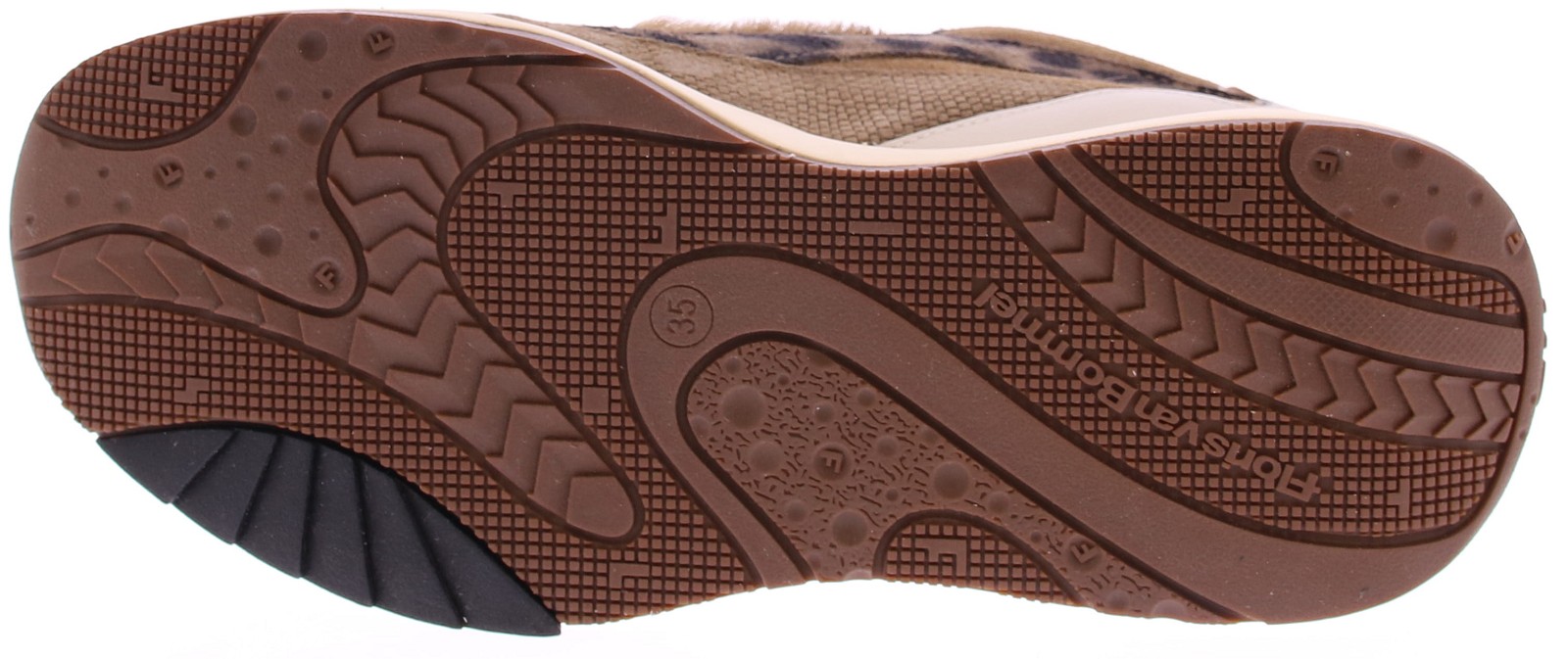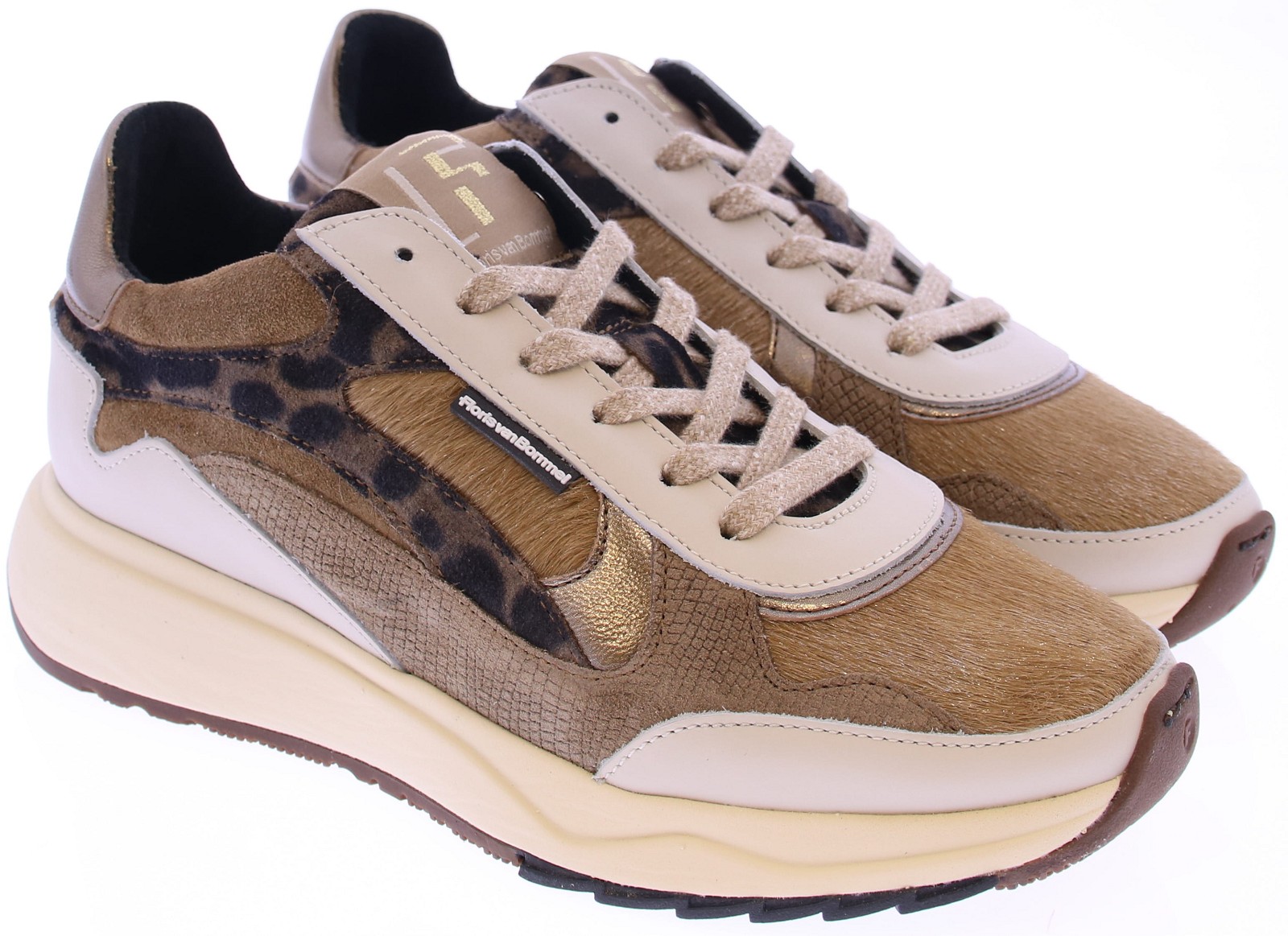 Taupe suede with leopard accents women's sneaker from Floris van Bommel. Model Suvi 03.04 taupe. This sneaker is beige with panels of textured leather. The sneaker has a lightweight sole with a durable TPU tread that not only provides a trendy look but also good grip and stability. The sneaker has a removable footbed, allowing you to use your own insoles. The shoe is G-width.