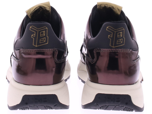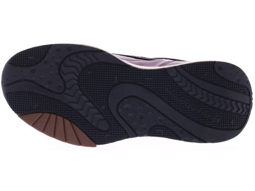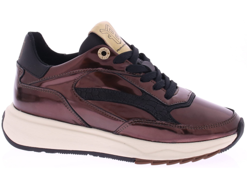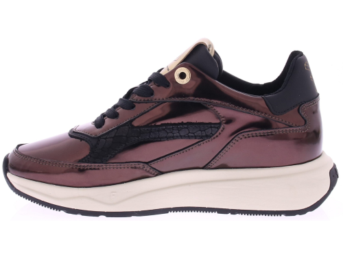 Dark brown polished leather with black accents women's sneaker from Floris van Bommel. Model Suvi 02.13. The sneaker has a lightweight sole with a durable TPU tread that not only provides a trendy look but also good grip and stability. The sneaker's footbed is removable, allowing you to use your own insoles. The shoe is G-width.