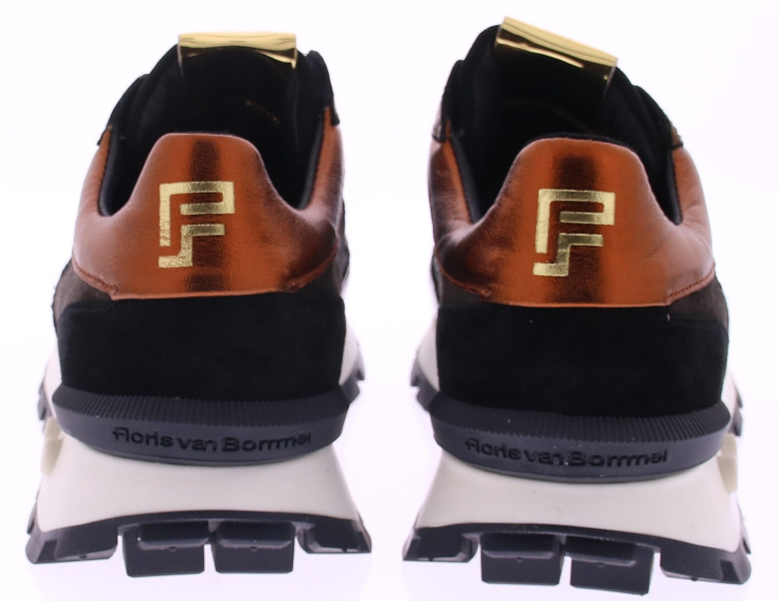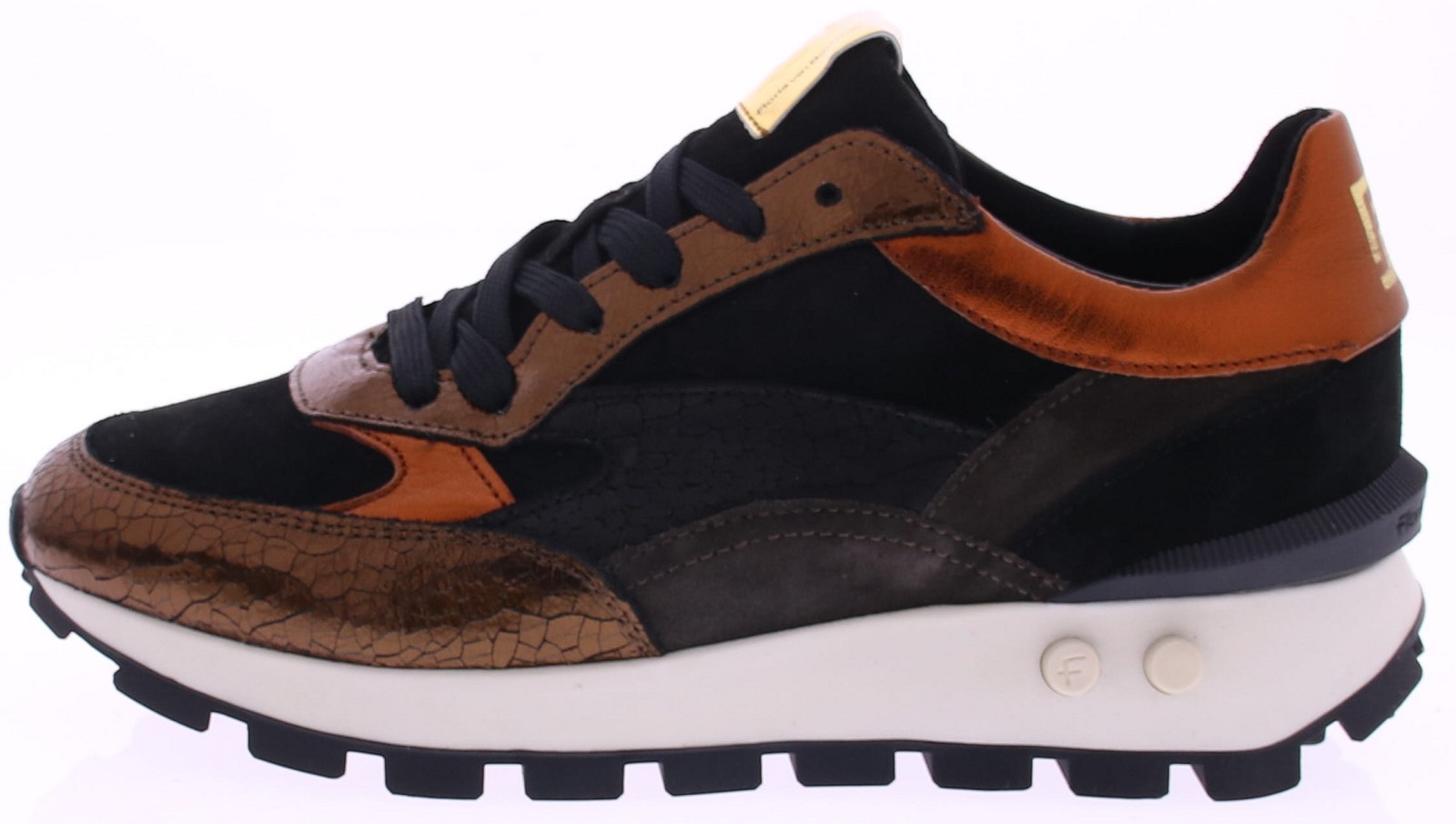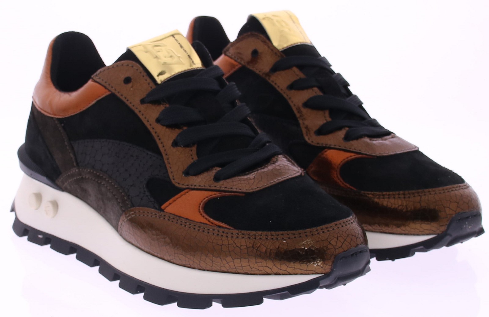 Brown, black, and bronze leather with suede women's sneakers from Floris van Bommel. These Blokki 04.21 sneakers are crafted from bronze and black leather with a crackled effect and attractive orange metallic accents. The lining is made of leather. The sneaker's footbed is removable, allowing you to use your own insoles. The rubber sole has a checkered tread for improved grip and stability. The shoe is G-width.