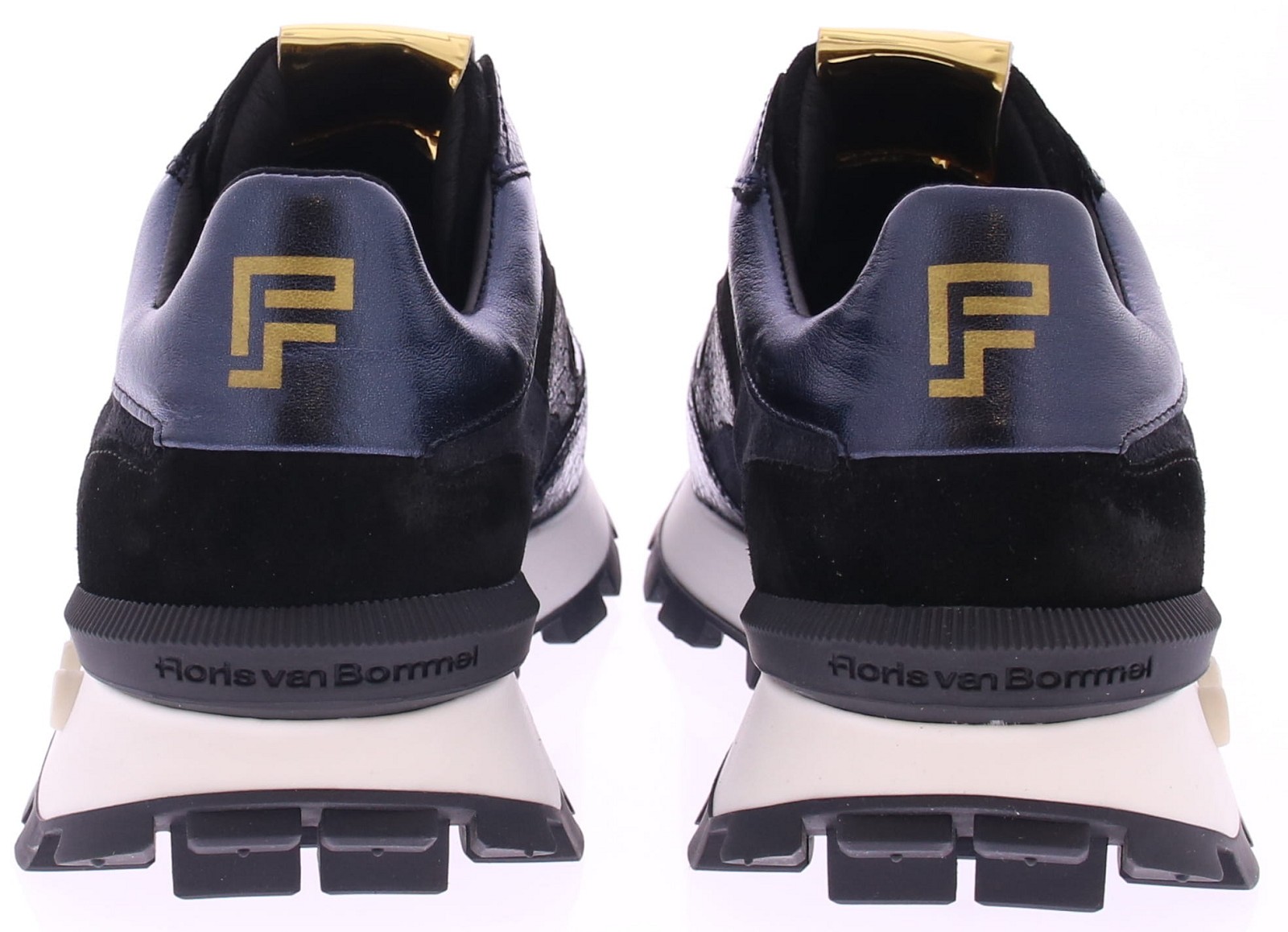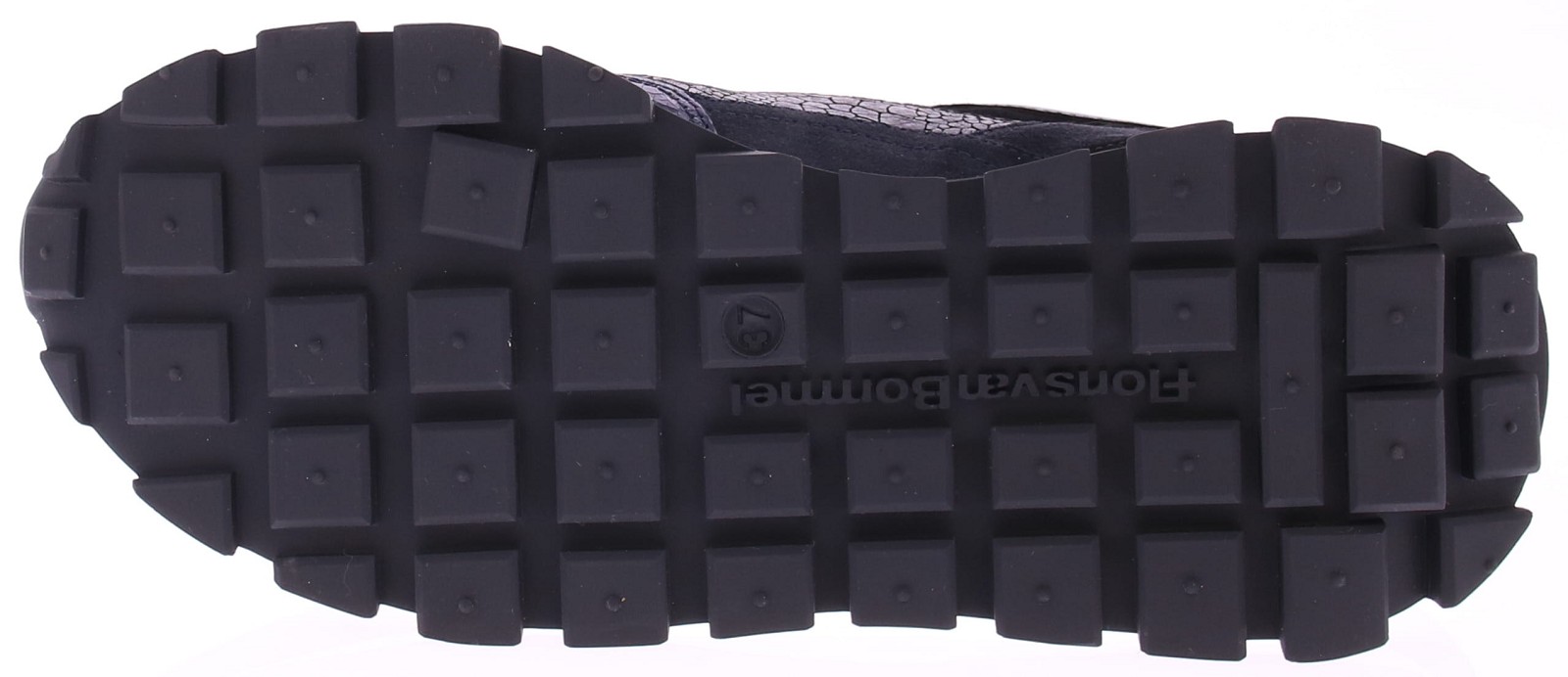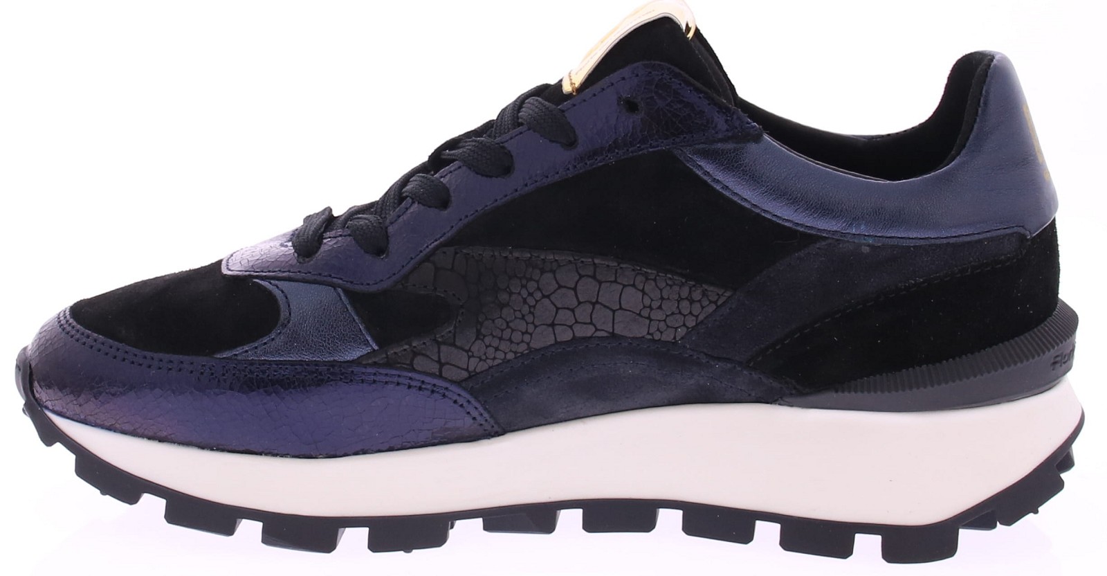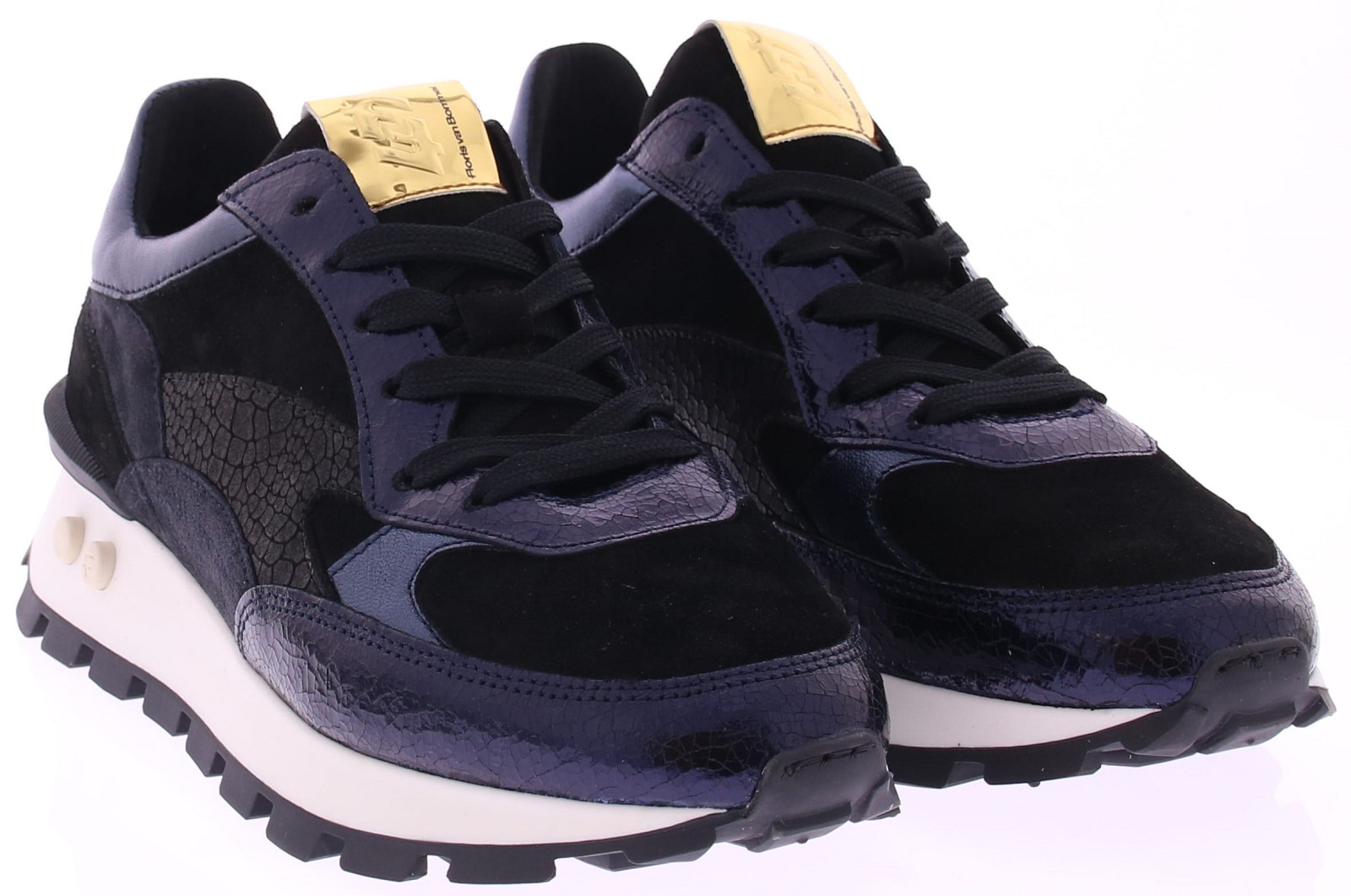 Dark blue and black metallic leather women's sneakers from Floris van Bommel. These Blokki 04.22 sneakers are made of dark blue and black leather with a crackled effect and attractive dark blue metallic accents. The lining is made of leather. The sneaker's footbed is removable, allowing you to use your own insoles. The rubber sole has a checkered tread for improved grip and stability. The width of the shoe is G.