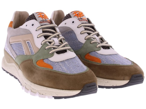 Multicolored men's sneaker from Floris van Bommel. The Treener 01.55. The sneaker is crafted from a rich blend of textile and suede. The interior is lined with high-quality leather. The exceptionally comfortable footbed, also covered in leather, is removable and can be replaced with your own footbed or arch support. This sneaker is made on a sporty last in a G1/2 width, meaning it also fits wider feet perfectly.