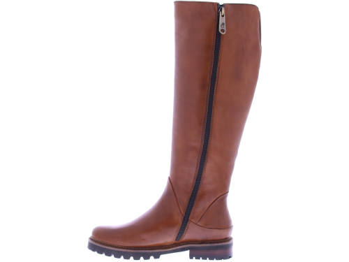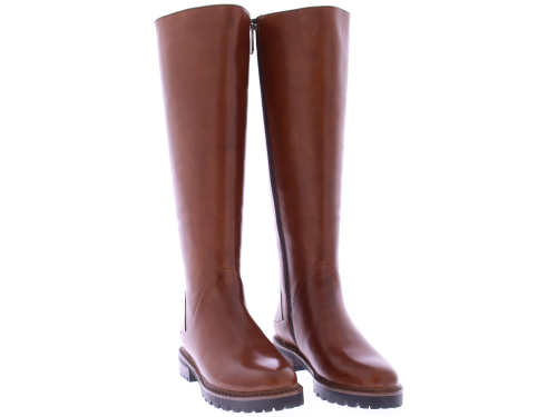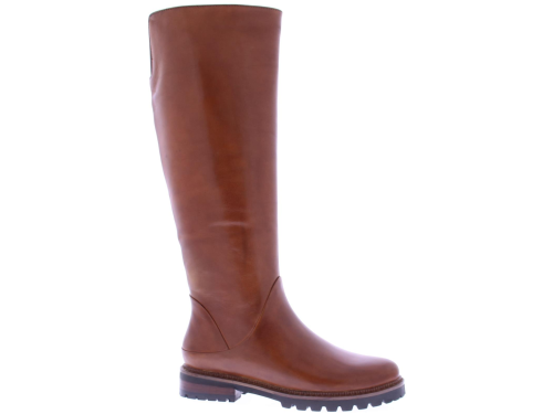 Cognac leather high boots for women from Ginger & Glove. These rugged boots with a round toe and a straight shaft are a must-have this winter. The slightly chunky sole is made of rubber, and the heel is 2 cm high. The boots are fur-lined. Pair these biker boots with a leather jacket and jeans for an edgy outfit.