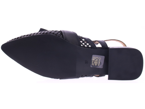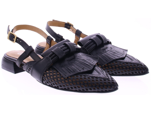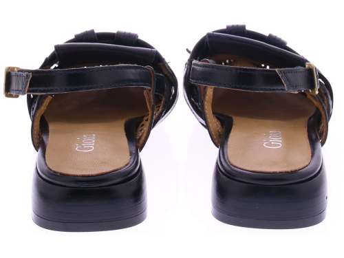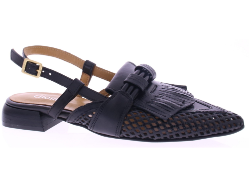 This black leather open-heel shoe from Gioia, the Zella model, is crafted from black leather with an elegant braided and perforated pattern on the forefoot. The adjustable slingback ensures a precise fit, while the subtle 2cm heel gives the style a feminine touch. A stylish shoe that pairs effortlessly with both summer dresses and trousers. Discover other women's shoes from Gioia at Klijsen.