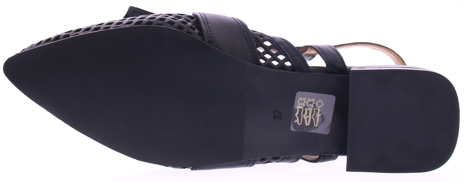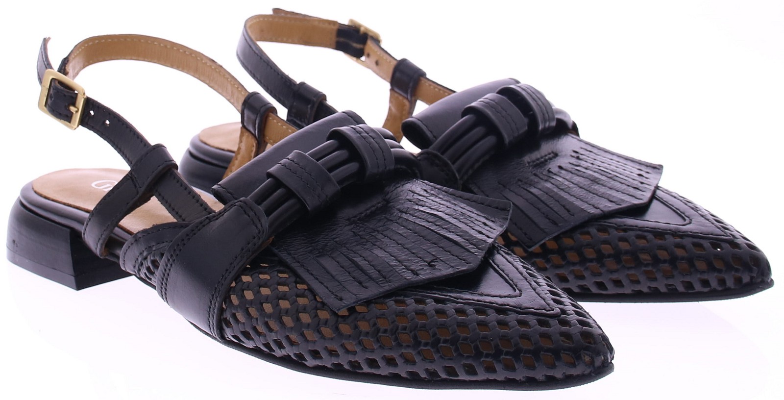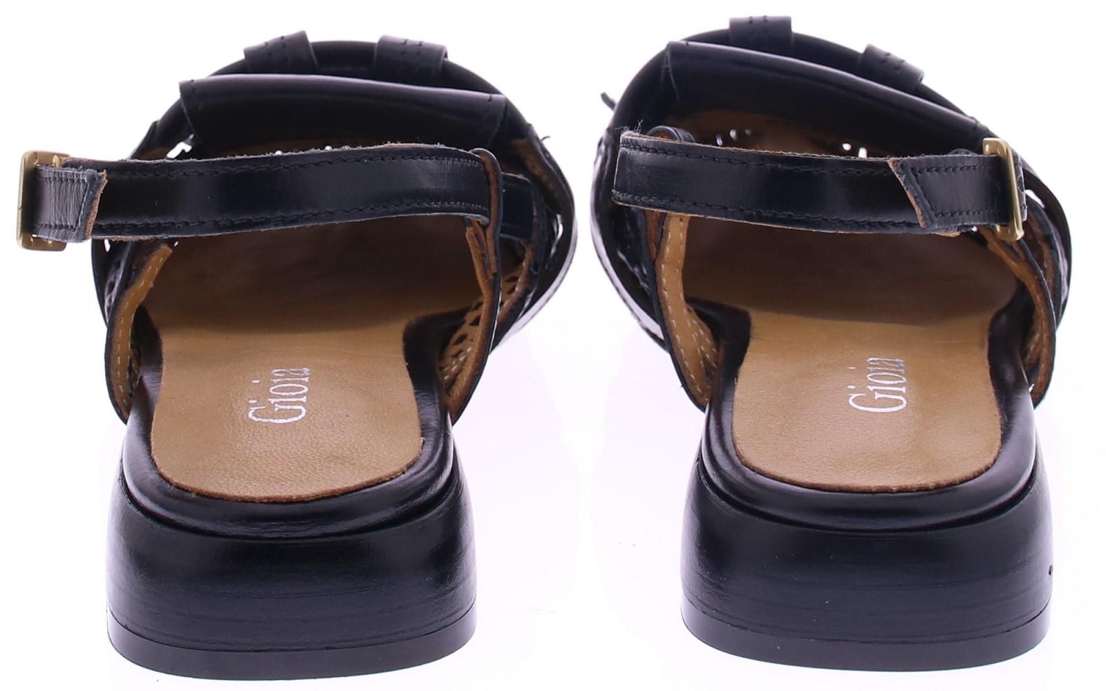 This black leather open-heel shoe from Gioia, the Zella model, is crafted from black leather with an elegant braided and perforated pattern on the forefoot. The adjustable slingback ensures a precise fit, while the subtle 2cm heel gives the style a feminine touch. A stylish shoe that pairs effortlessly with both summer dresses and trousers. Discover other women's shoes from Gioia at Klijsen.