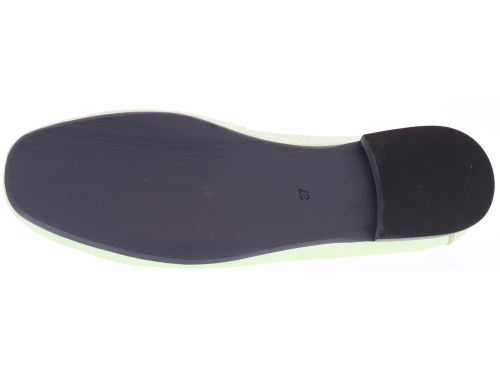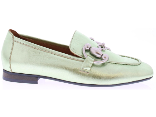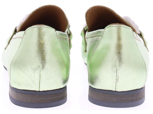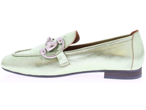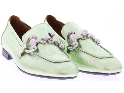 Mint metallic leather women's loafer by Babouche. This loafer has a matte silver trim over the instep strap. A nice loafer with leather lining and a heel height of 2 cm.
