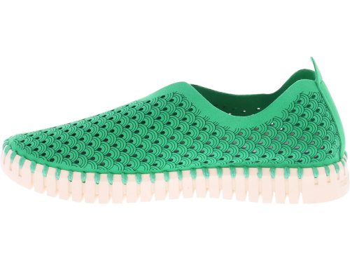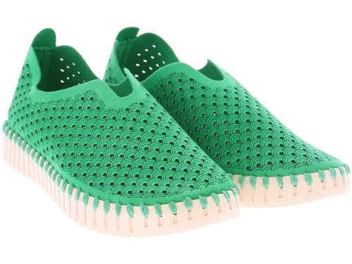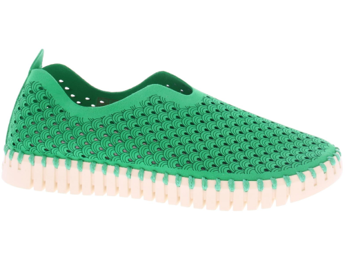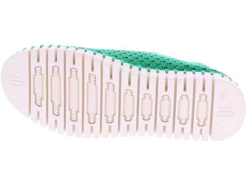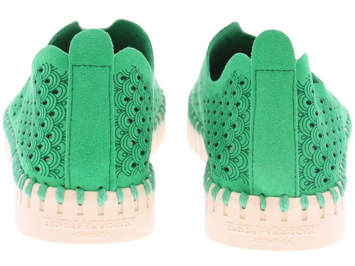 Green women's loafer by Ilse Jacobsen. This shoe is made of recycled microfiber, and has a sole stitched to the upper. The upper is decorated with a laser-cut pattern. The flexible sole is made of natural rubber. No glue is used for these shoes, and no animal products have been used. The footbed is removable