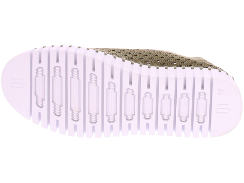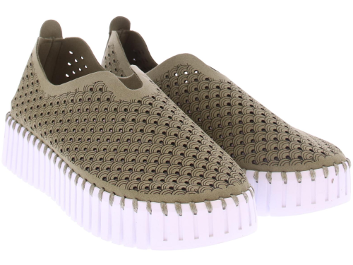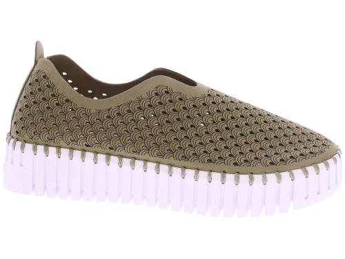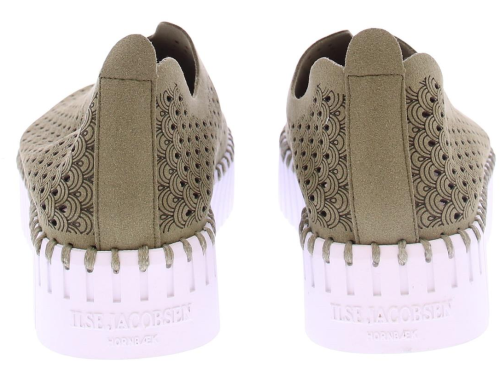 Army green women's loafer by Ilse Jacobsen, with the new trendy platform sole. The shoe is made of recycled microfiber, and has a sole stitched to the upper. The upper is decorated with a laser-cut pattern. The flexible sole is made of natural rubber. No glue is used for these shoes, and no animal products have been used. The footbed is removable.