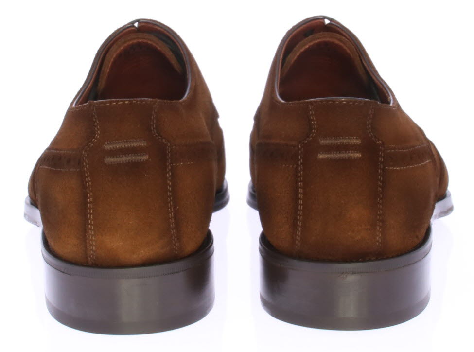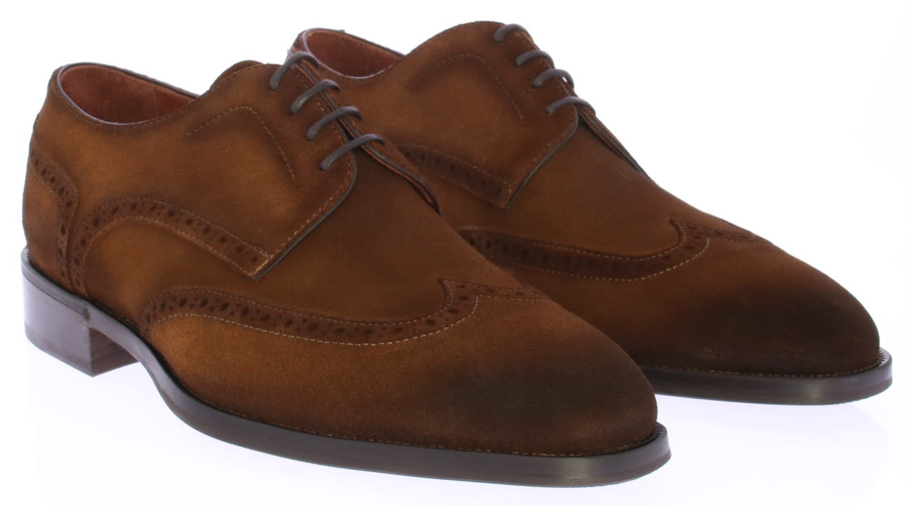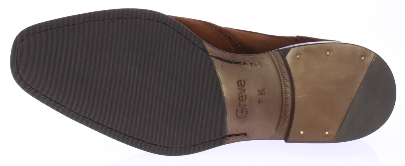 Cognac suede men's brogue shoe by Greve. The shoe is made on the K-last. This makes it very suitable for the wide foot. The shoe also has an insole so that it can be reduced in width to H last. The lining is made of leather and the sole of leather with rubber wear surface.