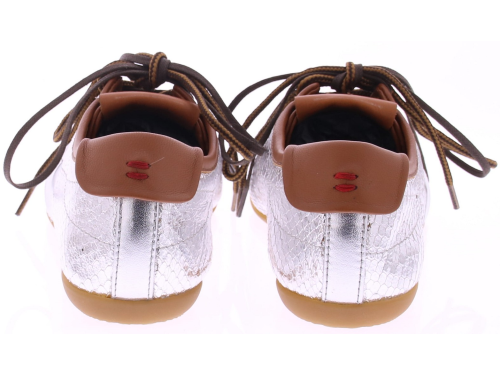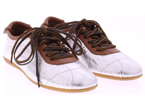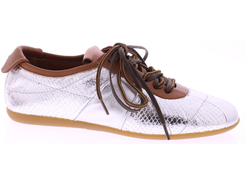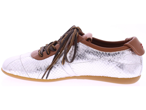 Silver leather women's sneakers from Halmanera. These silver leather sneakers from Halmanera exude pure class thanks to their refined combination of materials and colors. Crafted from super-soft leather with a subtle python print, they give the shoe a luxurious and contemporary look. The double laces in brown and light brown add a playful detail and allow you to customize the look to your liking.
