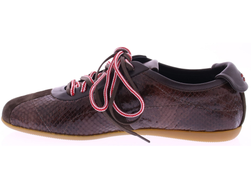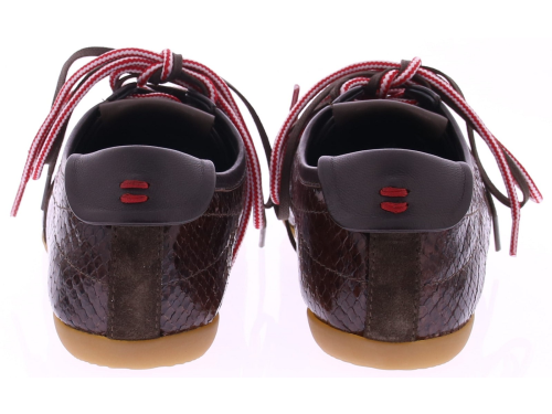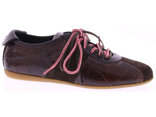 Dark brown leather women's sneakers from Halmanera. These brown leather sneakers from Halmanera exude pure class thanks to their refined combination of materials and colors. Crafted from super-soft leather with a subtle python print, they give the shoe a luxurious and contemporary look. The double laces in brown and red/white add a playful touch and allow you to customize the look to your liking.