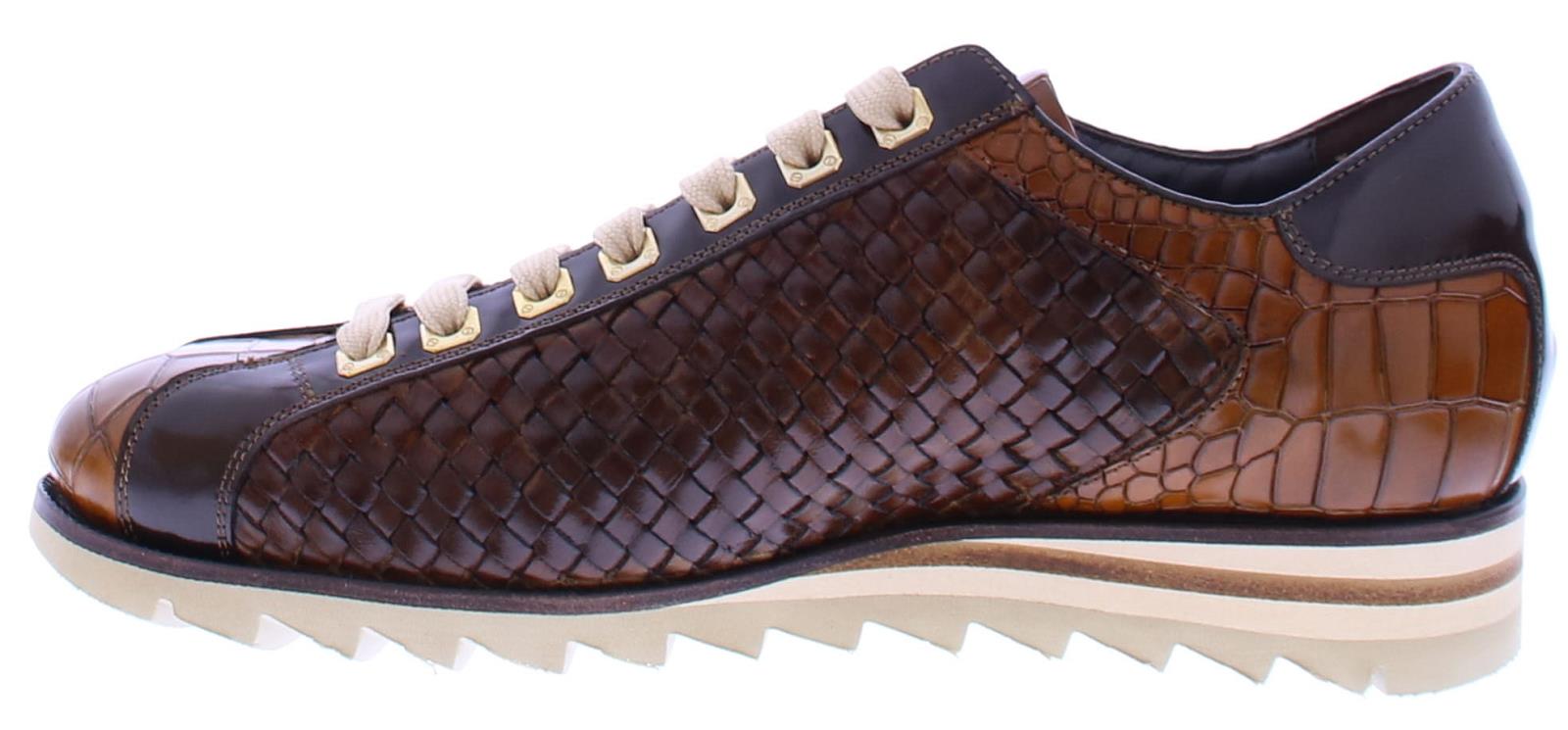 Brown leather men's sneaker by Harris. This sneaker is made of brown braided leather with a dark brown leather tongue. The sneaker comes on a beige rubber shark tooth sole.