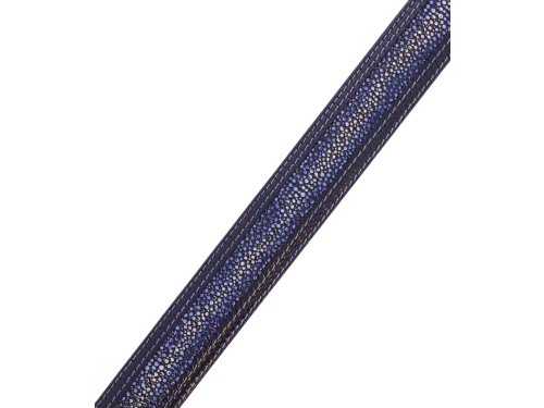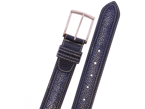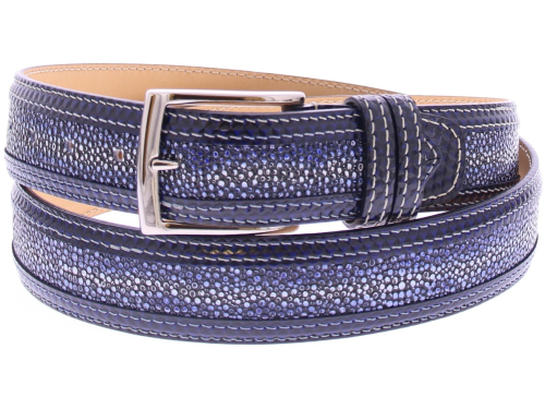 Men's belt from Harris. This belt features a center section of blue stingray-print leather. The outer edges are finished with dark blue leather. The belt can be shortened at the buckle. This belt matches the shoe from our collection, item number 43939.