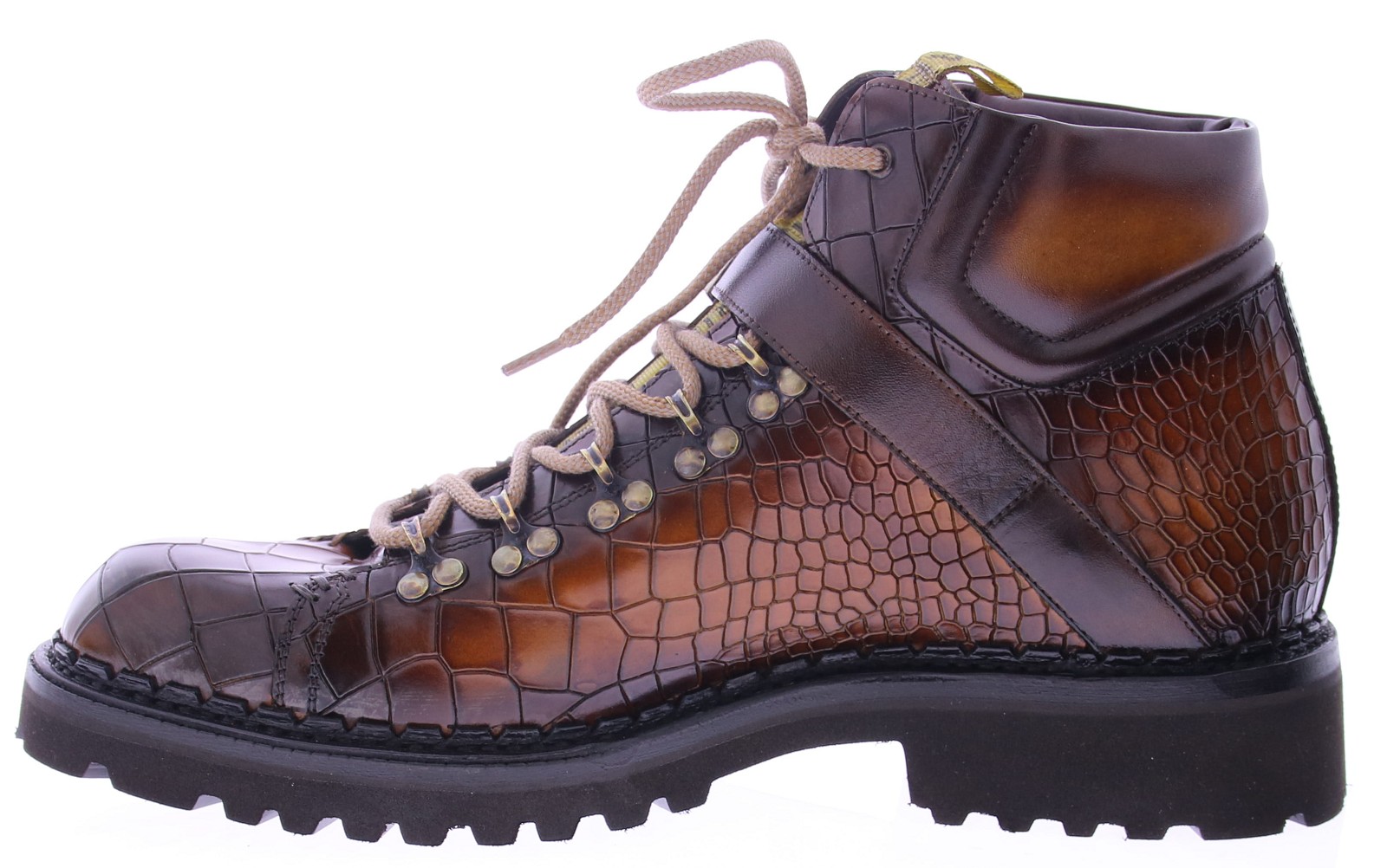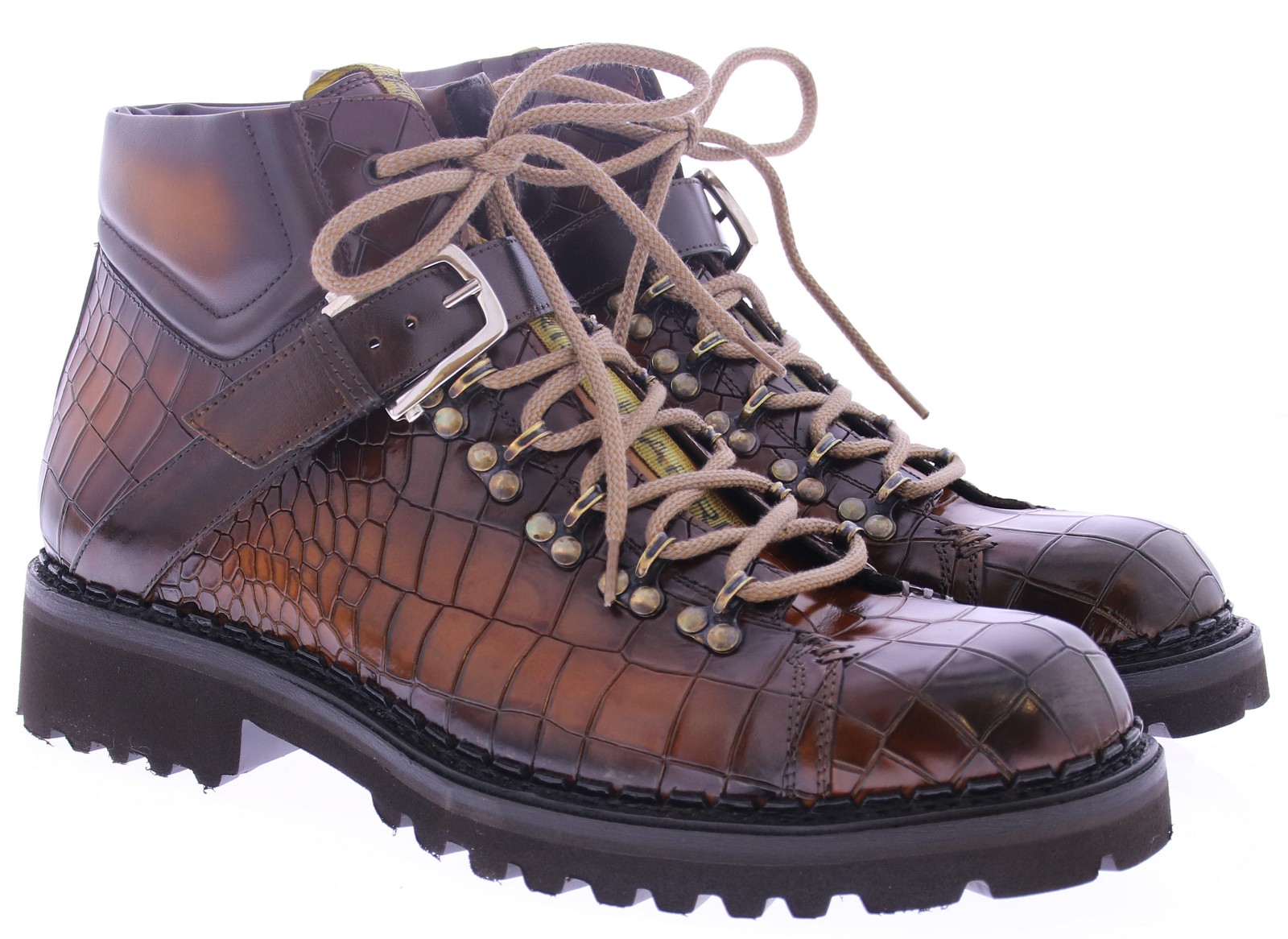 This exclusive men's mountain boot from Harris is a masterpiece of craftsmanship and style. Crafted from premium calf leather with a luxurious crocodile print, it features a unique hand-applied finish that gives each shoe its own distinctive character. The leather upper is enhanced by a buckle detail and a sturdy mountain closure with metal lace hooks, creating a rugged silhouette. The robust commando sole offers excellent grip and comfort, ideal for those who want to combine style with functionality. This Italian mountain boot is perfect for the modern man who values quality, detail, and design.