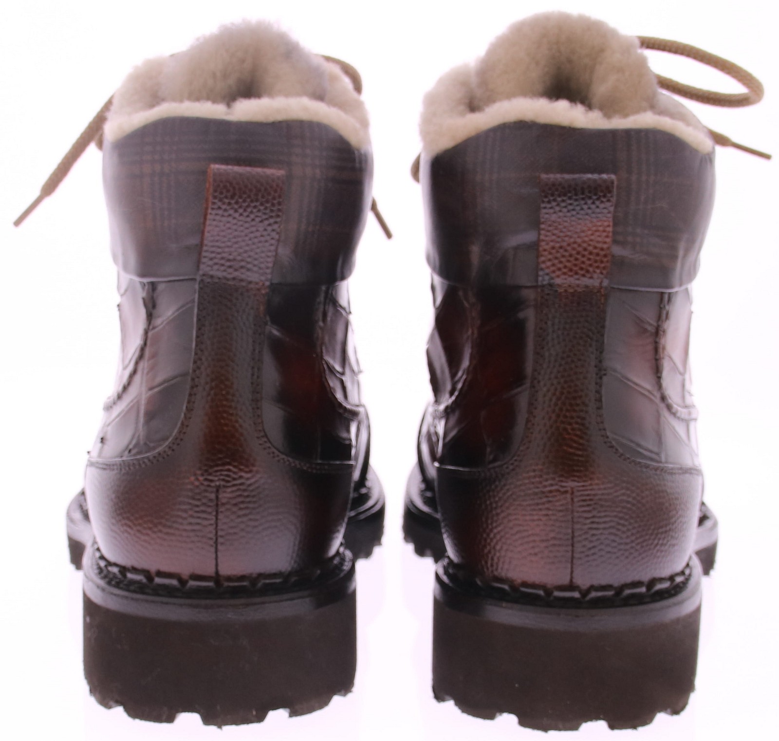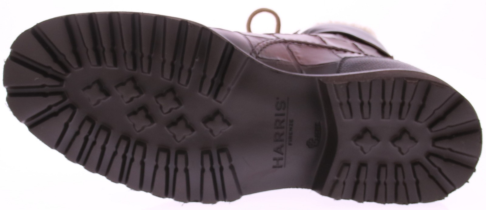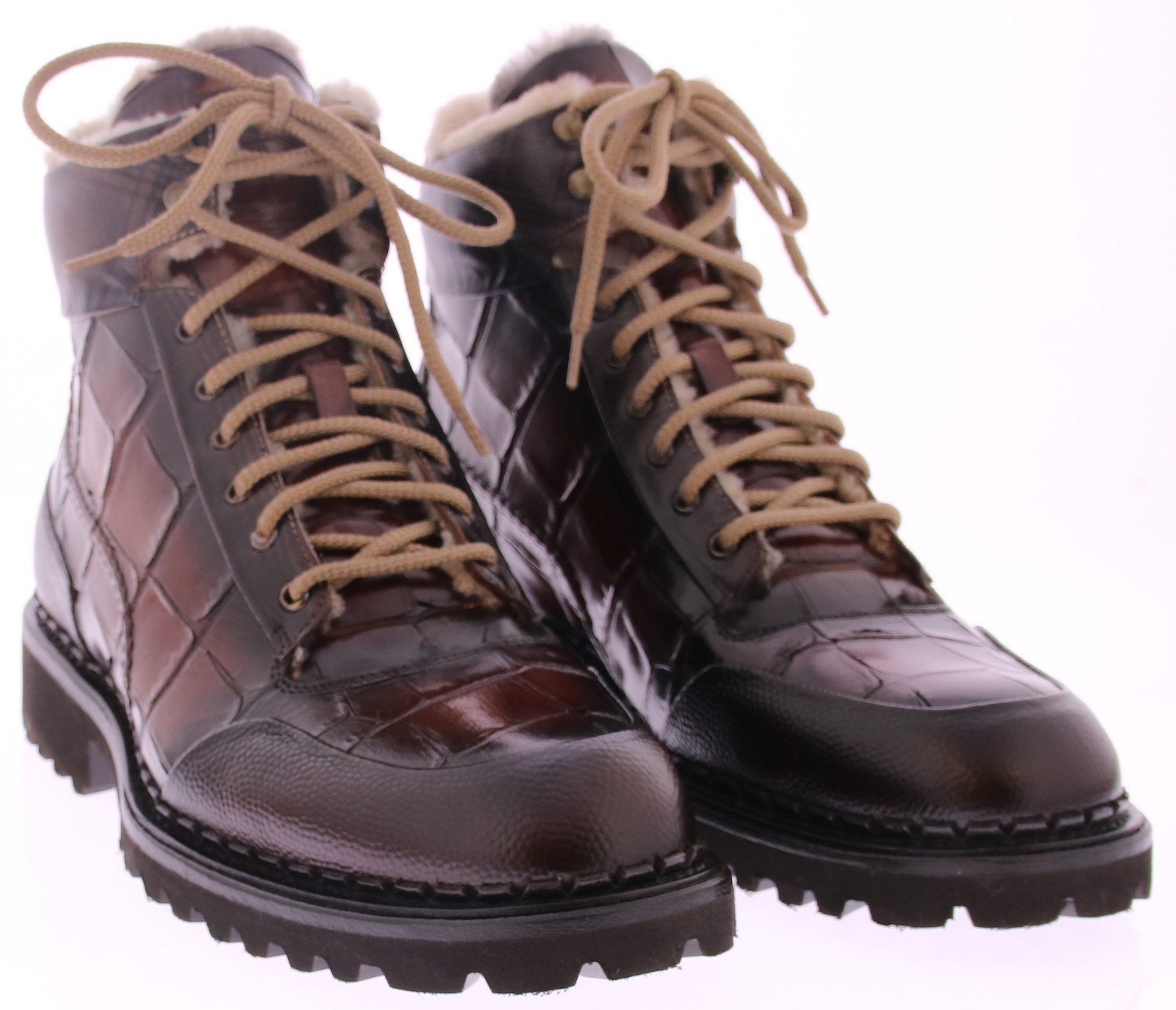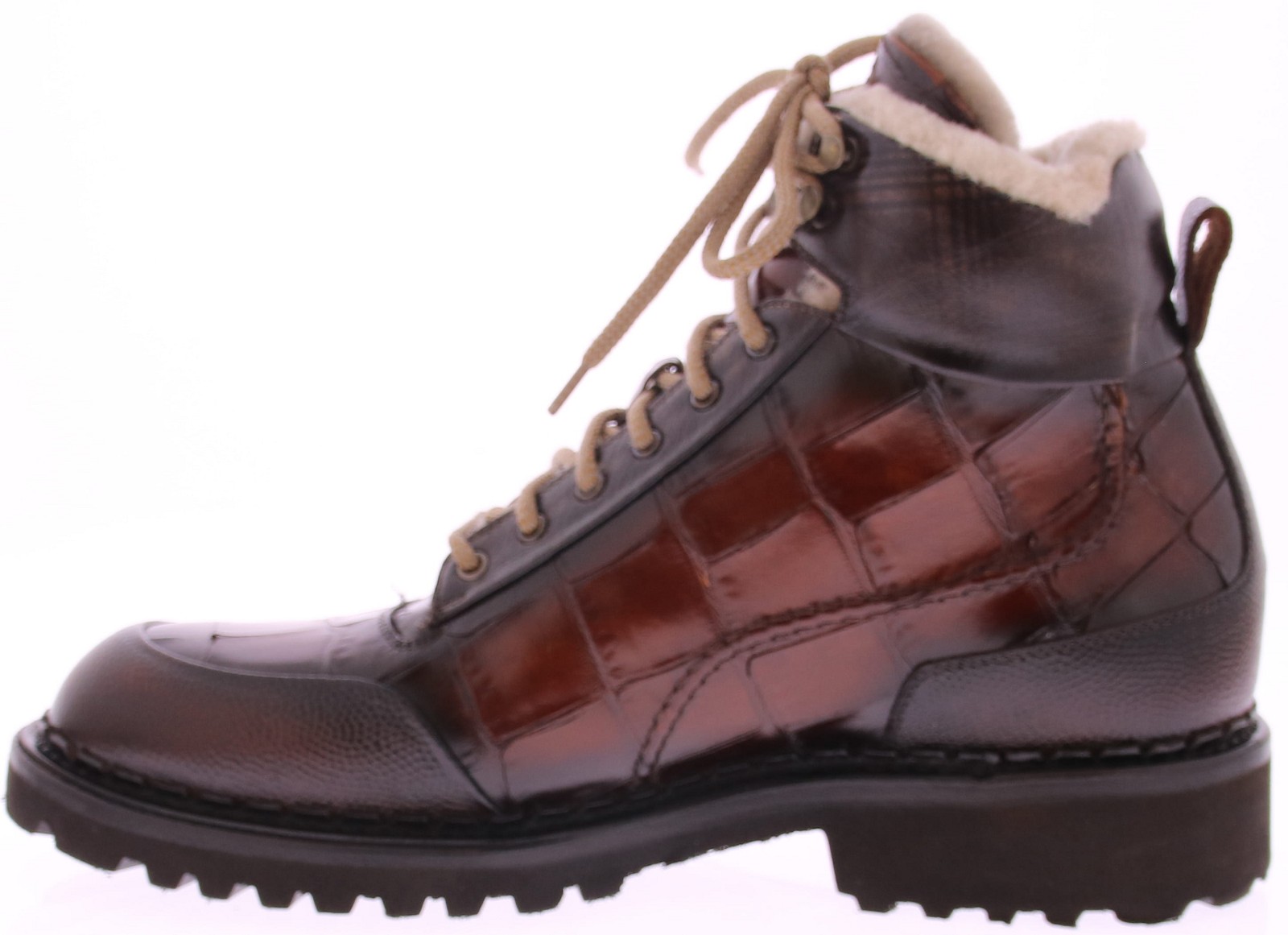 This rugged yet refined Harris mountain boot, model 0741, combines the best of traditional craftsmanship with luxurious materials. Crafted from premium calf leather in a deep, hand-polished cognac shade with a striking crocodile embossing, the cuff features a diamond-print pattern. Each pair is unique thanks to the artisanal finish and subtle color gradient. The interior is lined with soft lambskin, ensuring a warm, cozy feel on cold days. The classic mountain boot closure with metal eyelets and sturdy beige laces contributes to the authentic outdoor look, while the solid lug sole offers optimal grip and stability—both in the city and outdoors. This Harris mountain boot is the ideal choice for the stylish man who doesn't compromise on elegance, even in winter. The combination of luxurious leather, warm lining, and rugged silhouette makes this style a statement piece in any winter wardrobe.