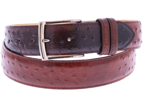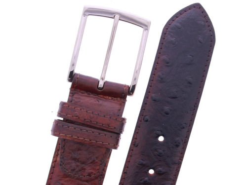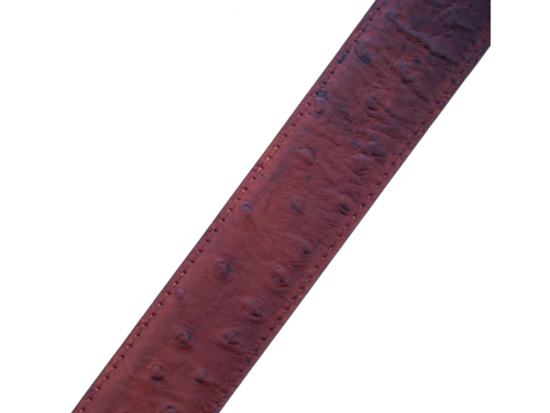 Red-brown leather men's belt from Haris, crafted from refined red-brown calf leather with a subtle ostrich print. The belt can be shortened at the buckle. This belt matches the shoe from our collection, item number 44152.