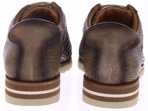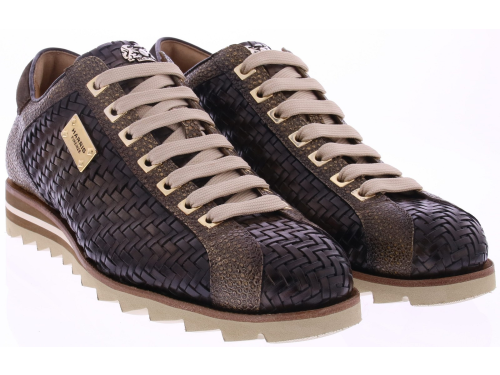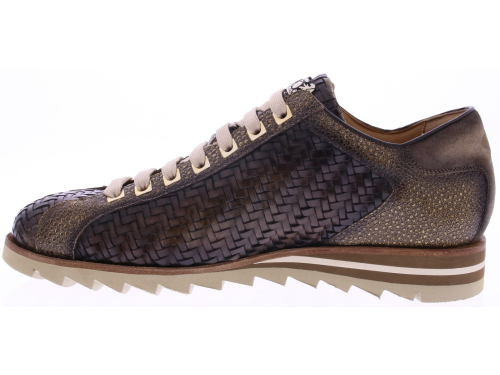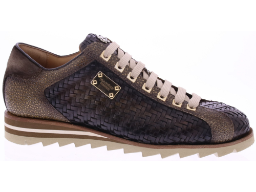 Brown leather men's sneakers from Harris. This exclusive sneaker combines high-quality smooth leather with refined braided leather on the sides and toe, creating a rich and luxurious look. The subtle texture in the leather is elegantly complemented by gold-colored eyelets and the signature Harris logo. The sturdy rubber sole and comfortable fit make this style suitable for everyday style. Discover other men's sneakers from Harris at Klijsen.