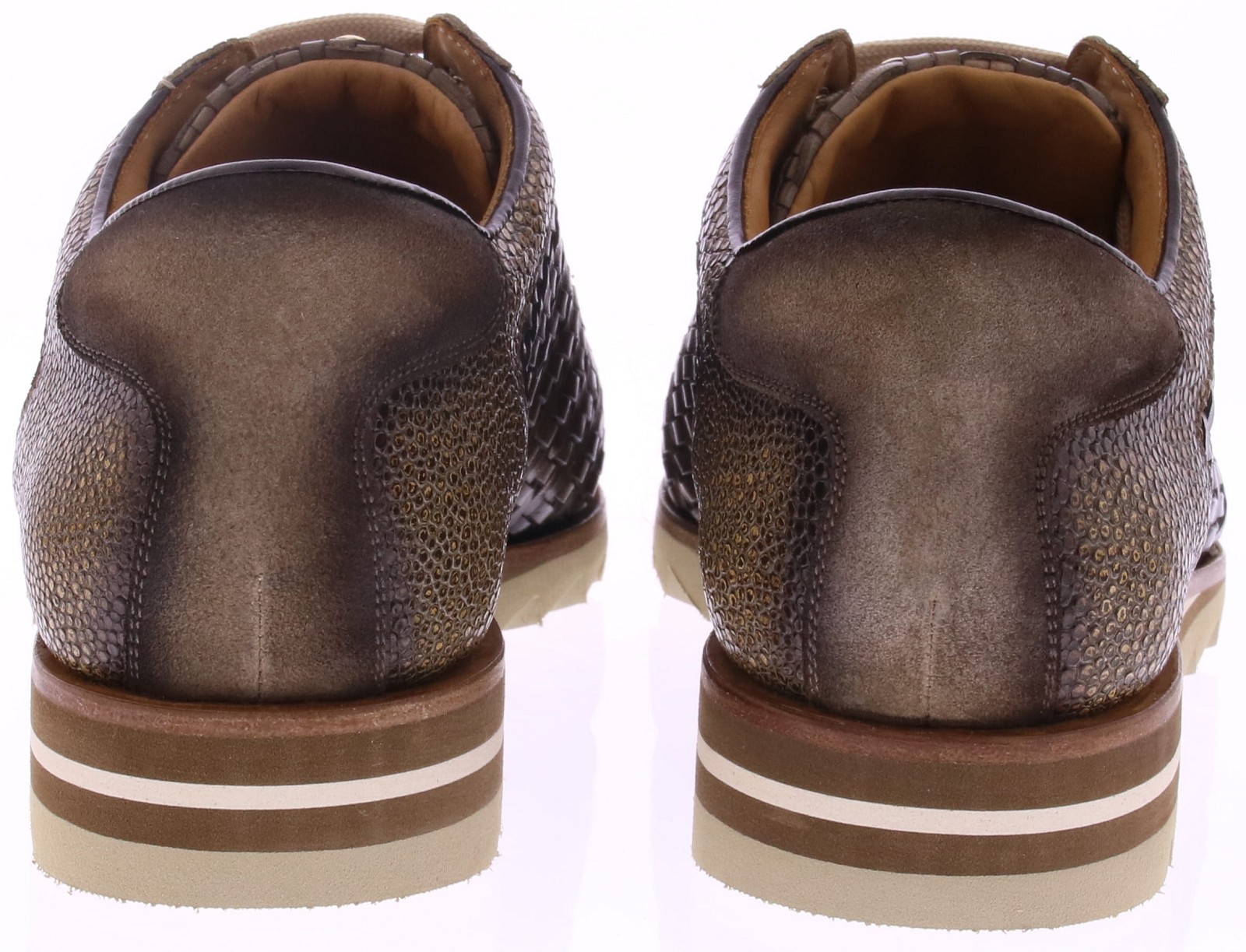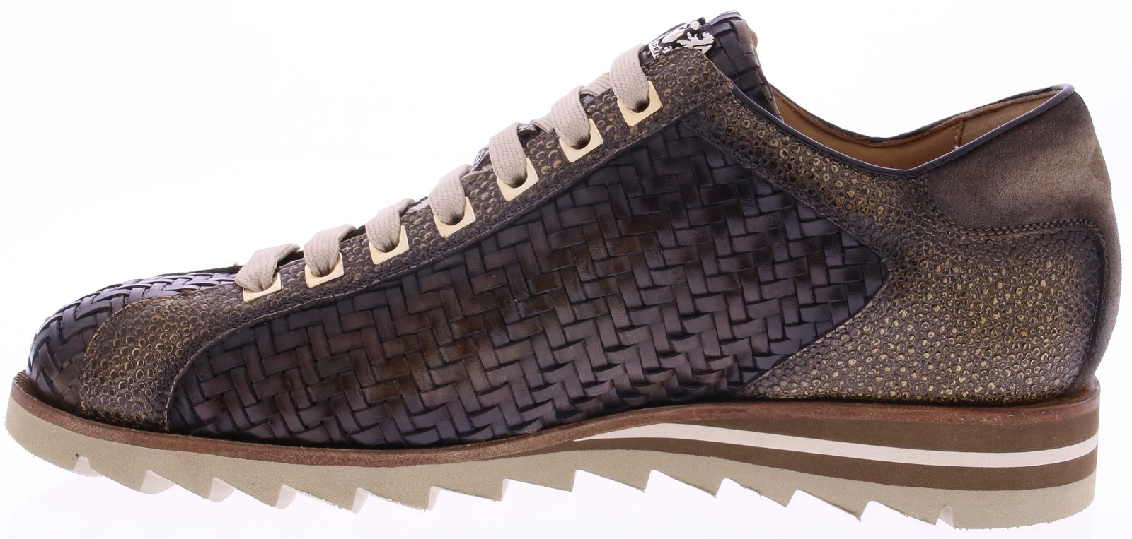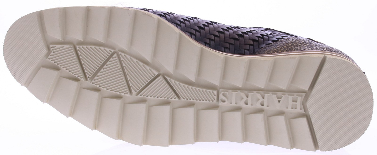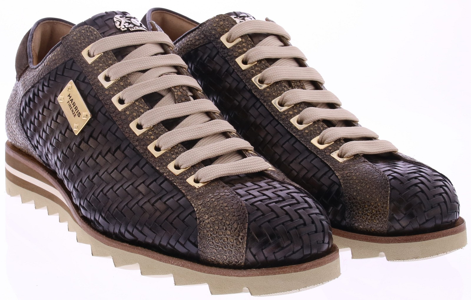 Brown leather men's sneakers from Harris. This exclusive sneaker combines high-quality smooth leather with refined braided leather on the sides and toe, creating a rich and luxurious look. The subtle texture in the leather is elegantly complemented by gold-colored eyelets and the signature Harris logo. The sturdy rubber sole and comfortable fit make this style suitable for everyday style. Discover other men's sneakers from Harris at Klijsen.