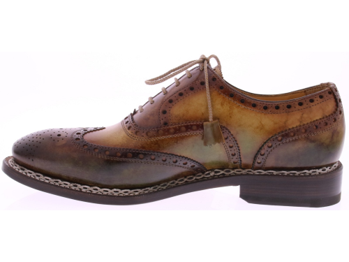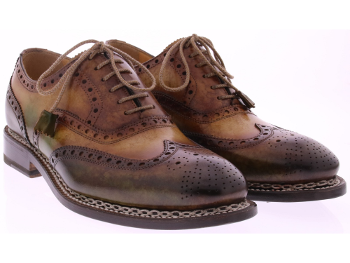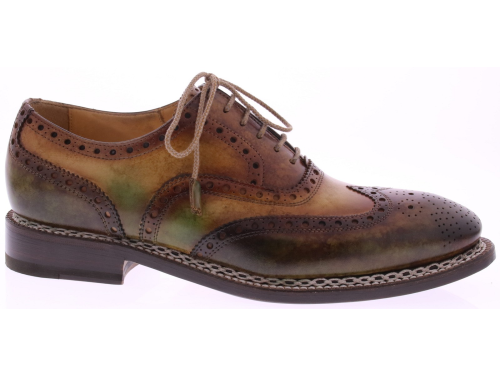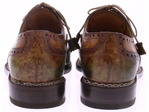 Green cognac and brown leather men's brogue from Harris. This stylish lace-up shoe is crafted from high-quality leather with a rich patina finish in shades of green, cognac, and brown, featuring classic brogue perforations. The shoe is fully leather-lined and offers a comfortable, luxurious fit. The leather sole features a rubber outsole for added grip and durability, combining elegance with practicality. Discover other men's lace-up shoes from Harris at Klijsen.