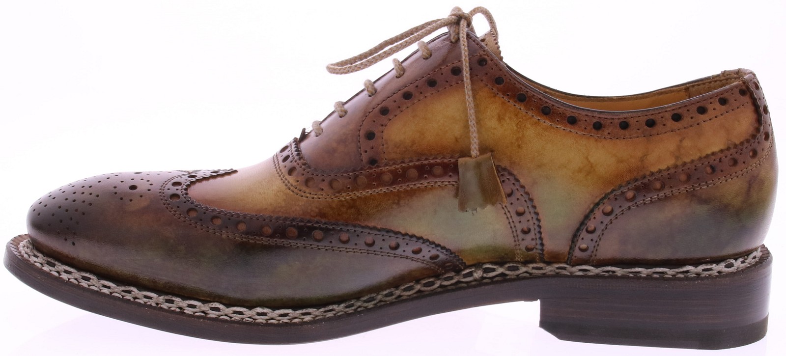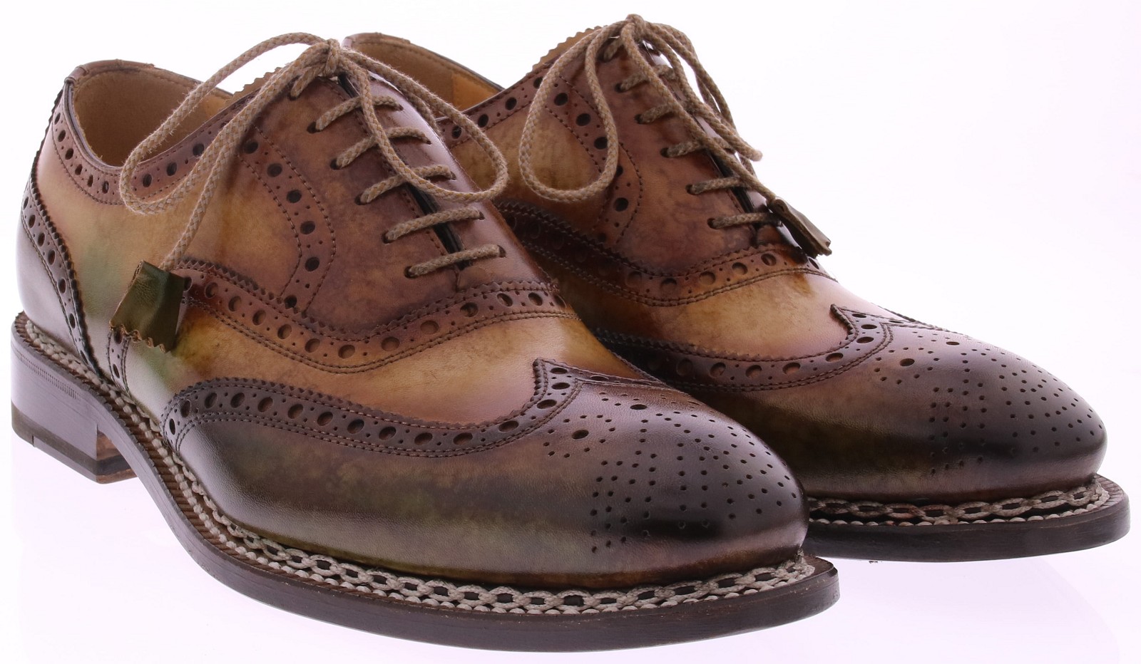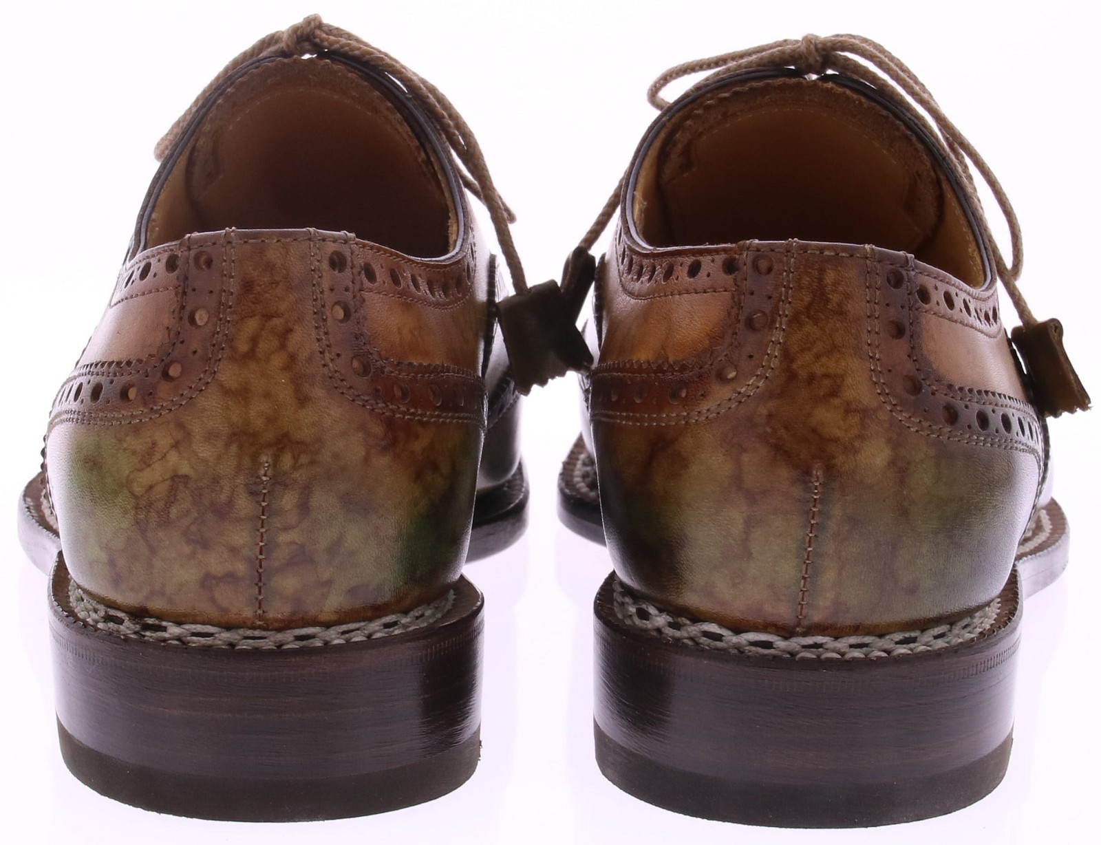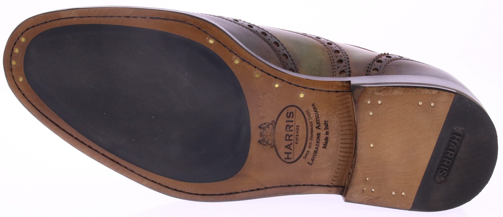 Green cognac and brown leather men's brogue from Harris. This stylish lace-up shoe is crafted from high-quality leather with a rich patina finish in shades of green, cognac, and brown, featuring classic brogue perforations. The shoe is fully leather-lined and offers a comfortable, luxurious fit. The leather sole features a rubber outsole for added grip and durability, combining elegance with practicality. Discover other men's lace-up shoes from Harris at Klijsen.