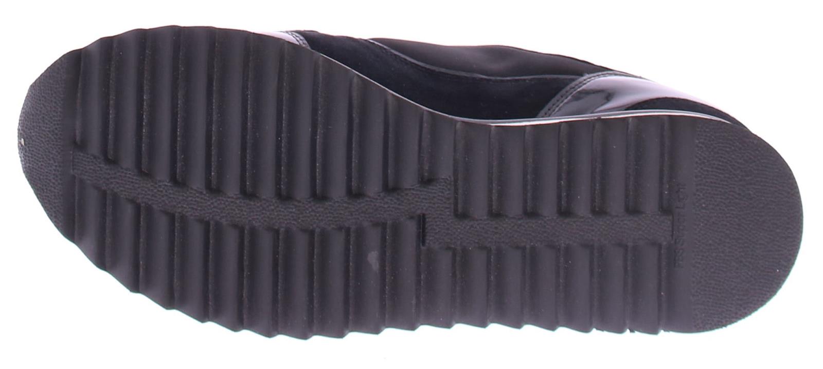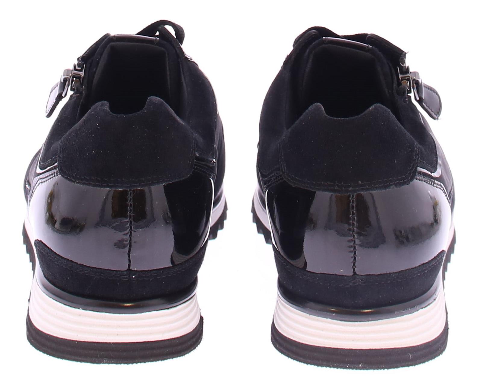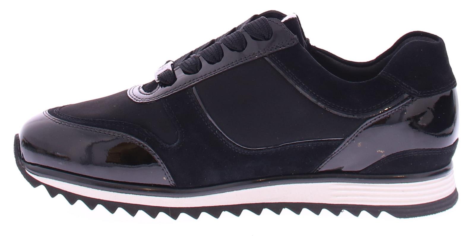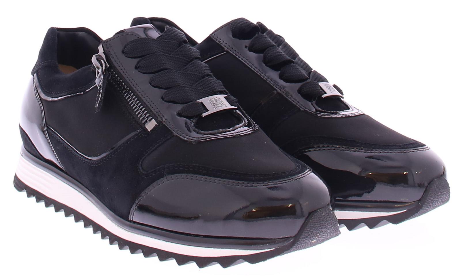 Black women's sneaker by Hassia. The sneaker is made of a combination of suede with fabric and patent leather. The shoe has a zipper for easier entry. The width is H and the insole is removable.