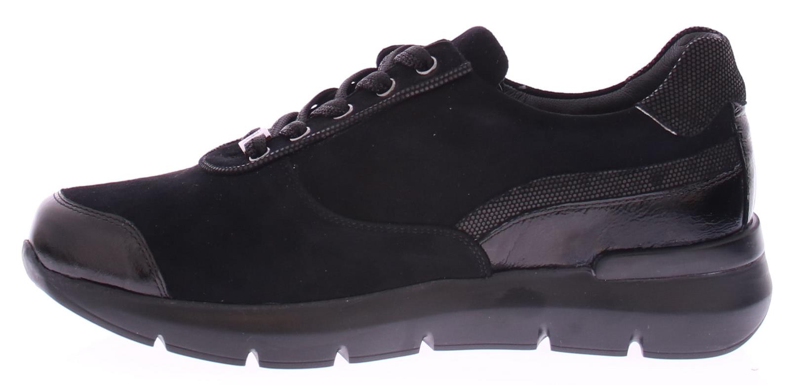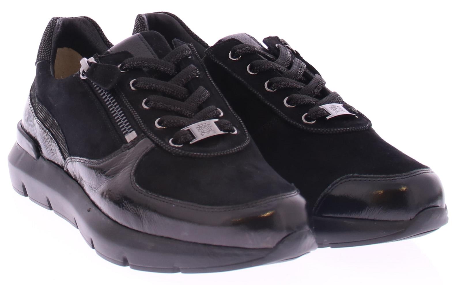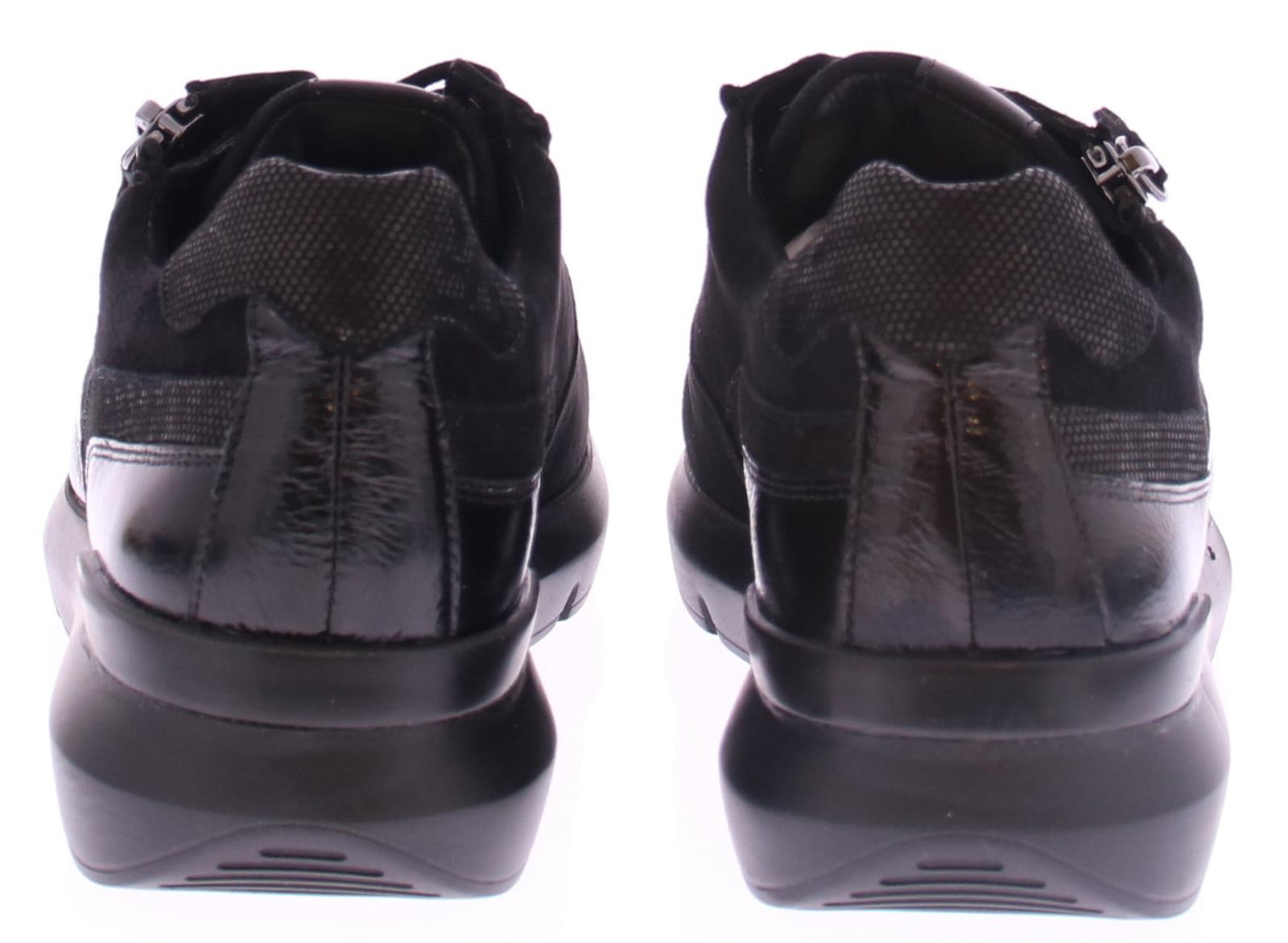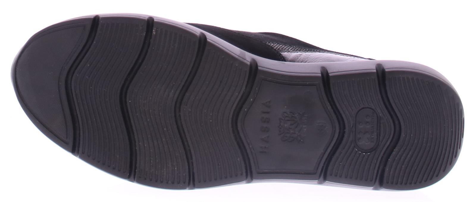 Black suede women's sneaker by Hassia. This sneaker is made of a combination of suede and patent leather. The zipper next to the lace makes it easy to put on and take off. The width is H and the insole is removable.