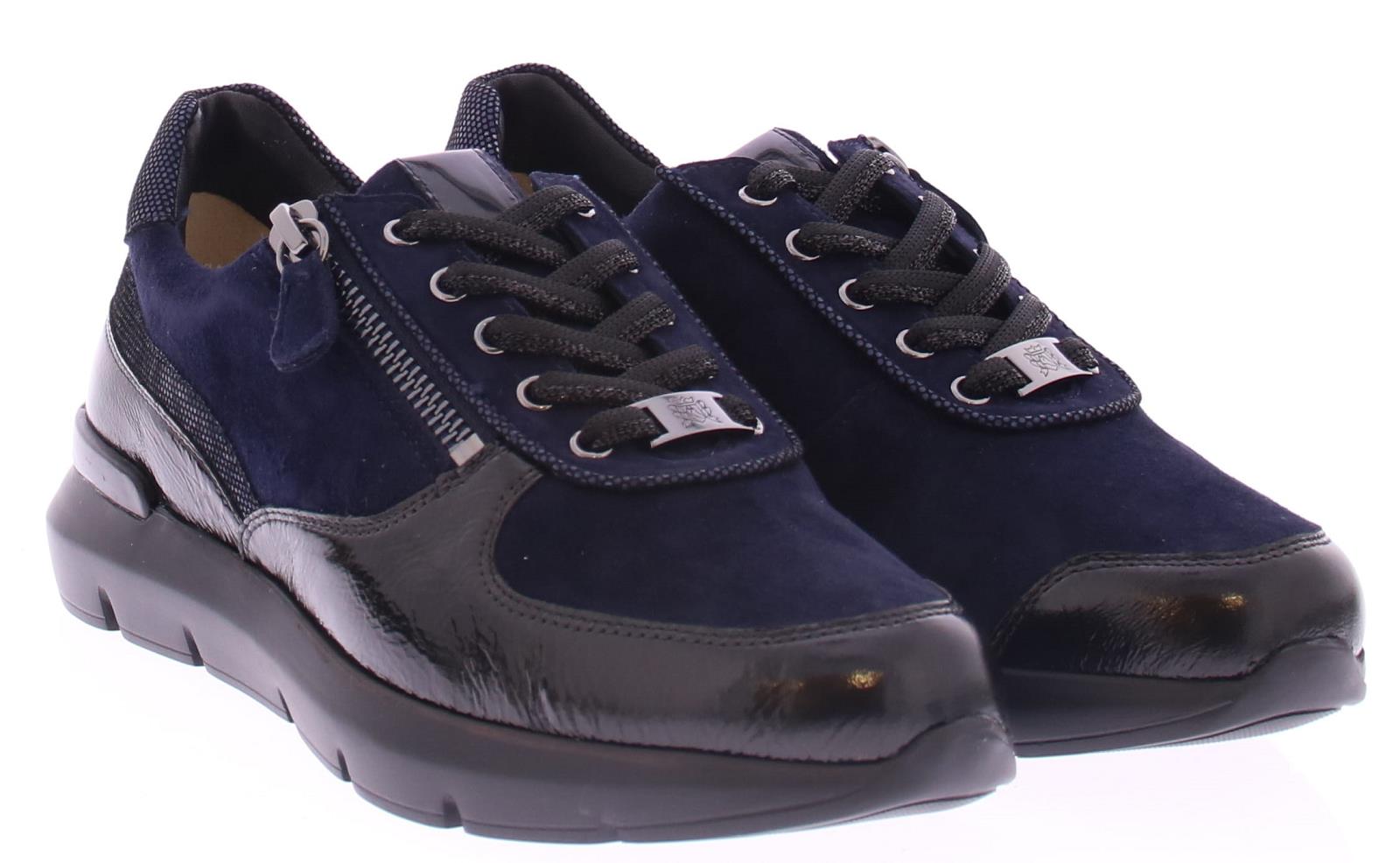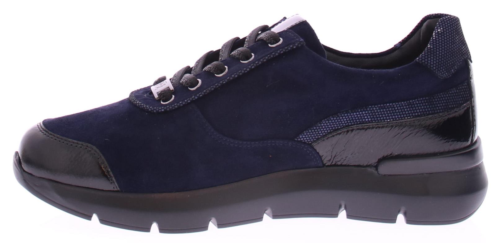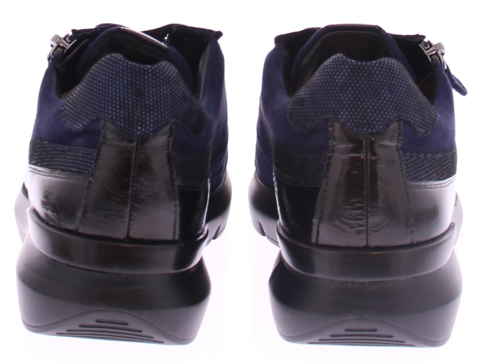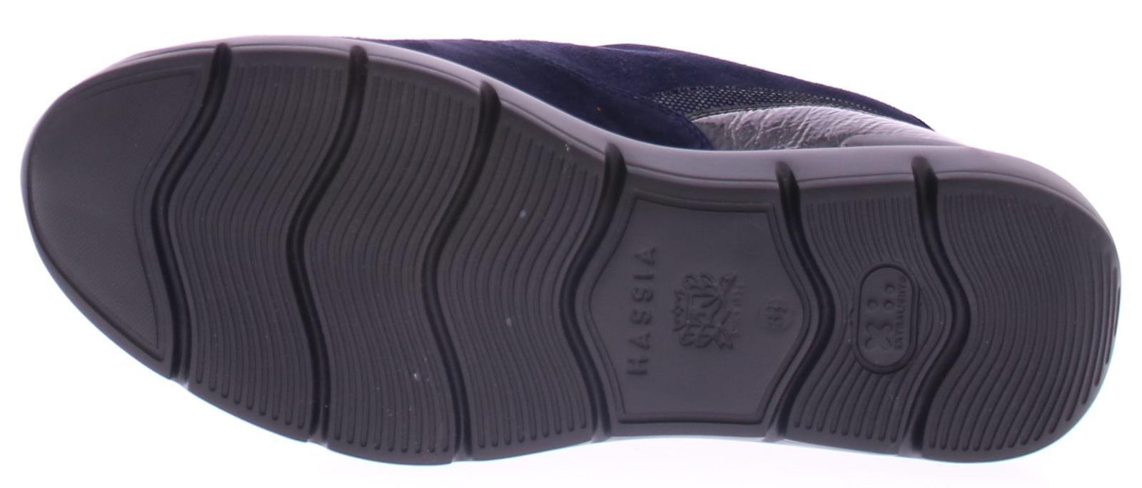 Dark blue leather women's sneaker by Hassia. This sneaker is made of a combination of blue suede and black patent leather. The zipper next to the lace makes it easy to put on and take off. The width is H and the insole is removable.