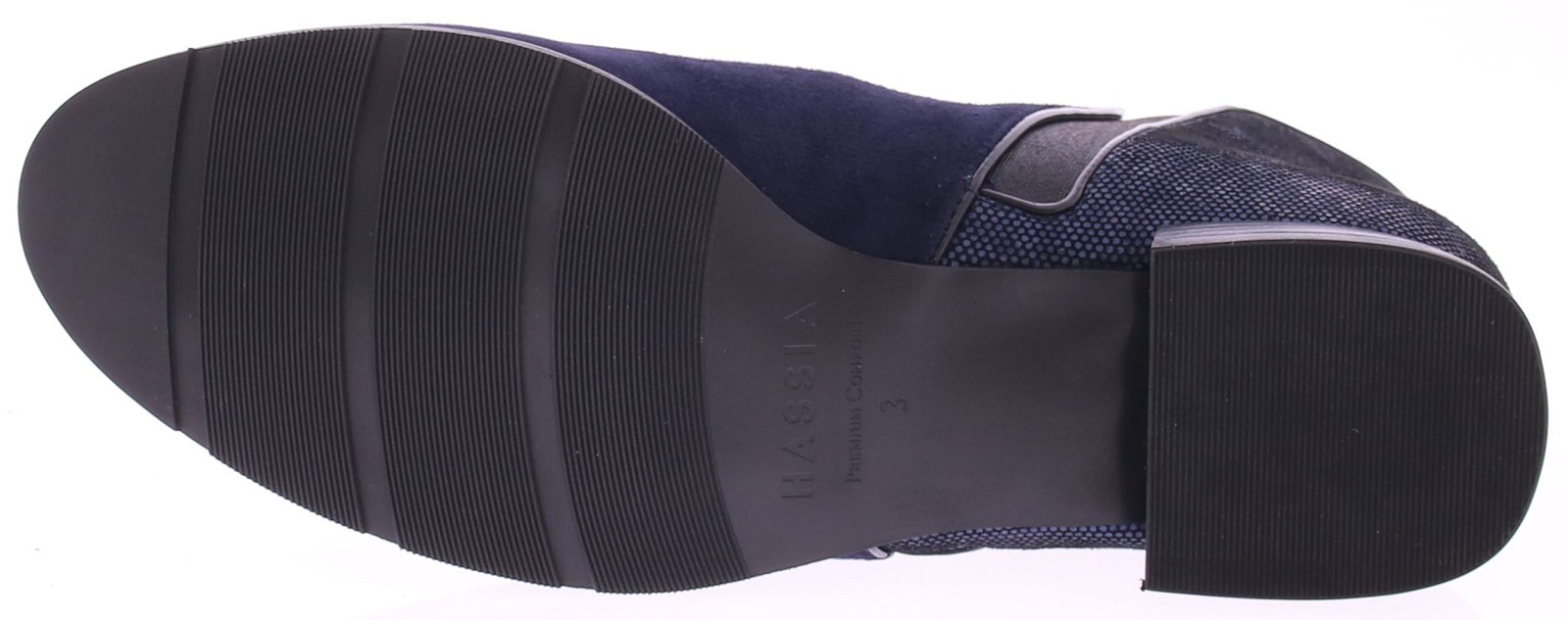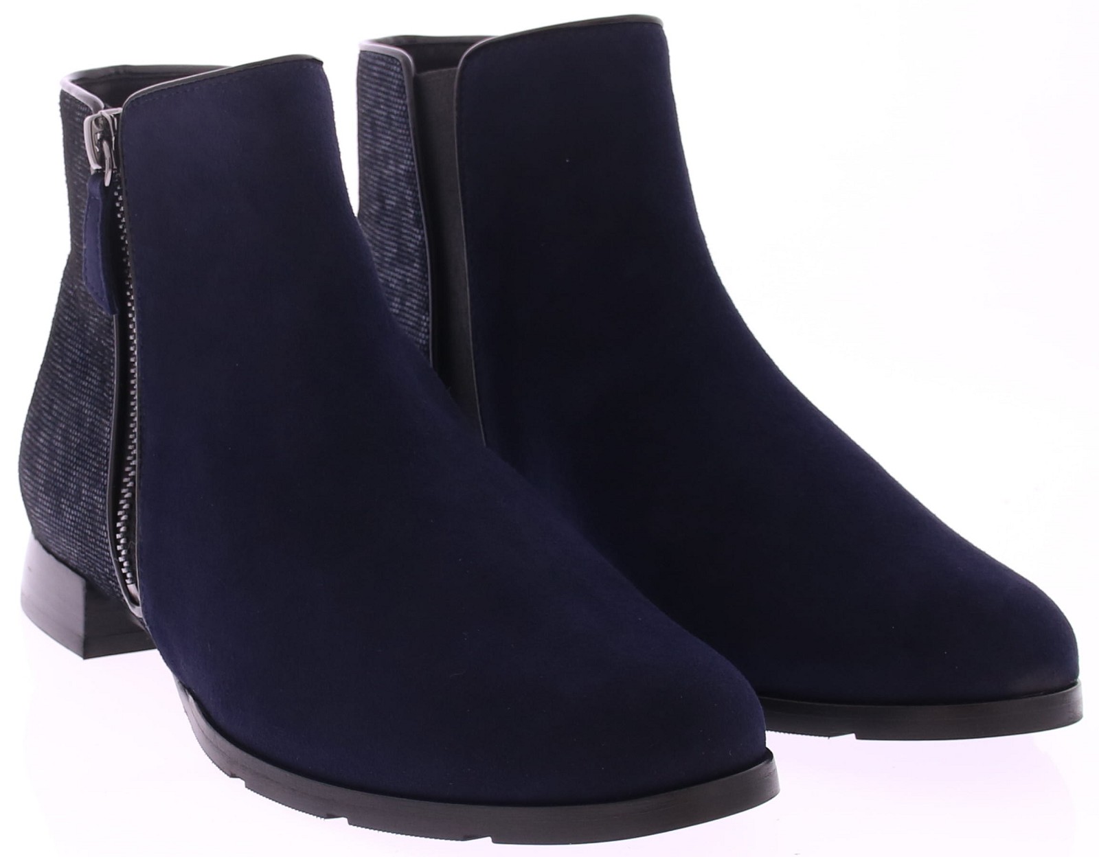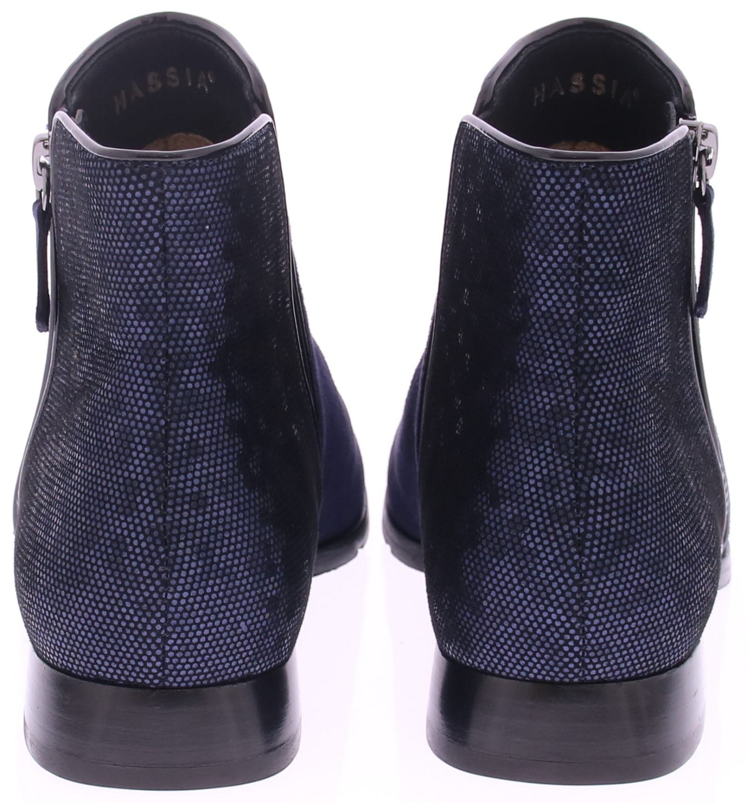 Dark blue suede women's ankle boots from Hassia. Made in an H width with a removable footbed and an outer zipper. The vamp is made of plain suede, and the back features a delicate suede print. The heel is 2 cm and the sole is rubber.