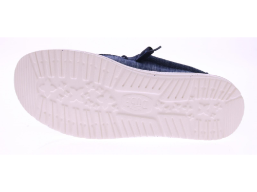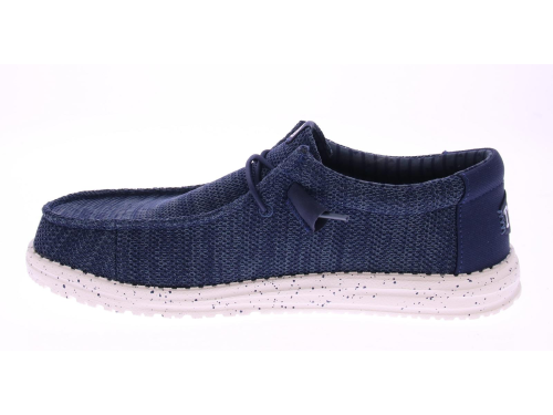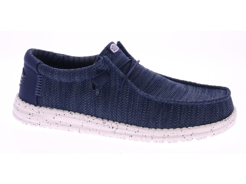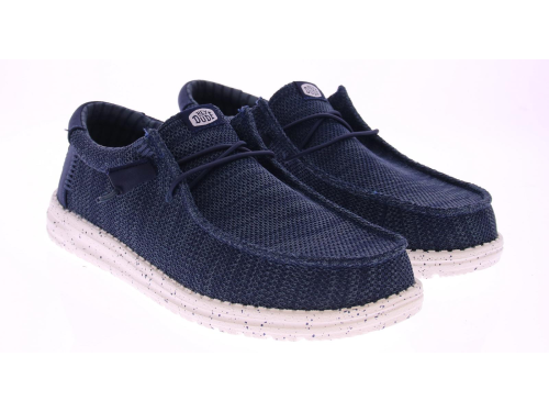Dark blue men's loafers from Hey Dude. These ultra-lightweight loafers with a highly stretchy upper are often sold as flip-flop replacements. They're incredibly comfortable, and the upper is made from recycled PET bottles combined with a lightweight foam sole.