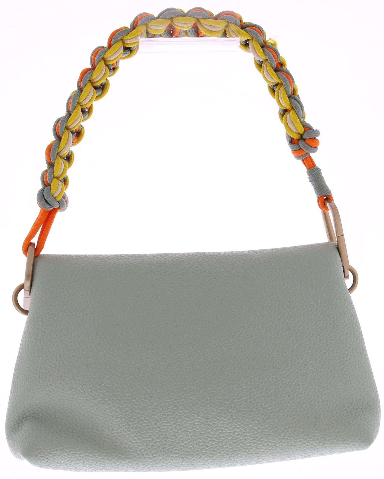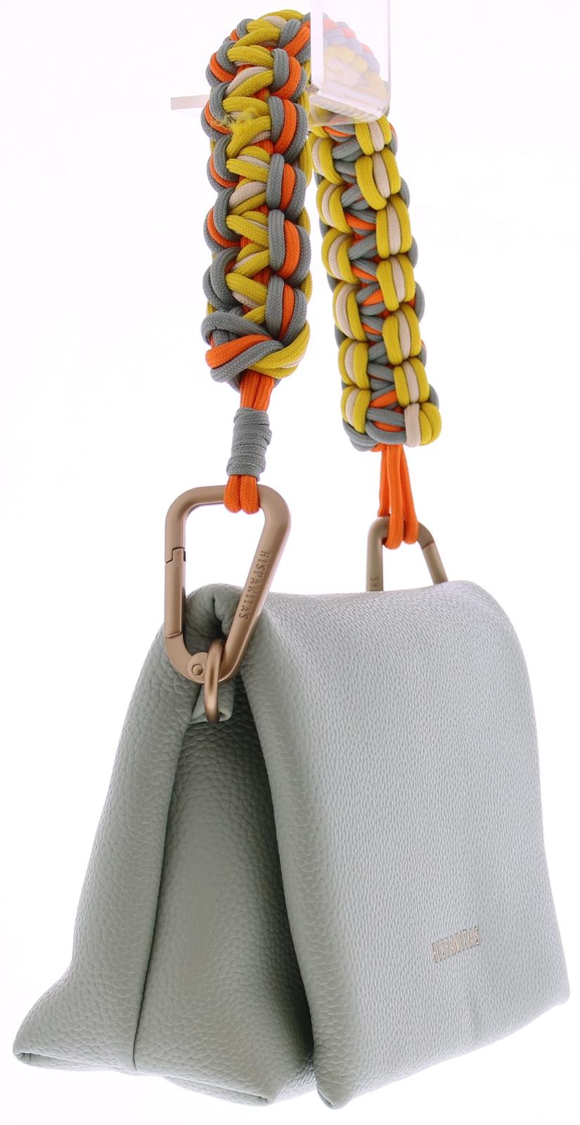Green ("eucalipto") leather women's bag from Hispanitas BV253846. It complements several shoes from our Hispanitas collection. The leather has a fine texture. The bag closes with a flap closure and magnetic snap. The playful shoulder strap is made of a sturdy braided fabric in a green-orange-yellow-beige color combination. It comes with a longer green leather strap. The interior features a slightly larger central compartment and two side pockets, one with a zipper and one without.