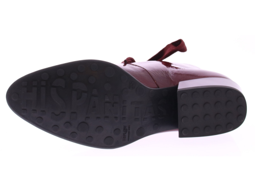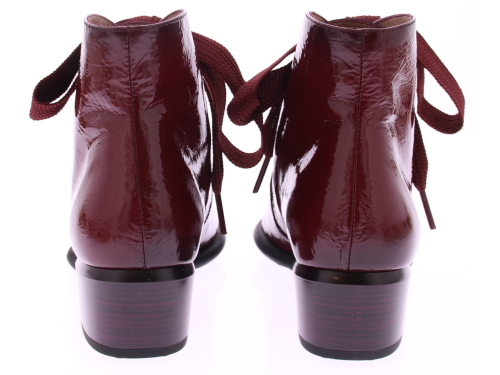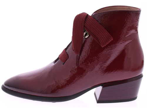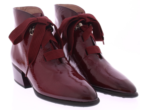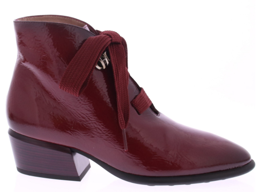 This women's short boot from Hispanitas combines modern style with a touch of classic elegance. The wine-red patent leather gives the boot a chic look, while the wide laces add a bold accent. The pointed toe and slightly angled 4cm heel create a refined, feminine look that perfectly balances elegance and comfort. Versatile enough to wear with both casual and more formal outfits, this boot offers all-day comfort. The sturdy heel provides stability, while the patent leather gives the boot a timeless charm.