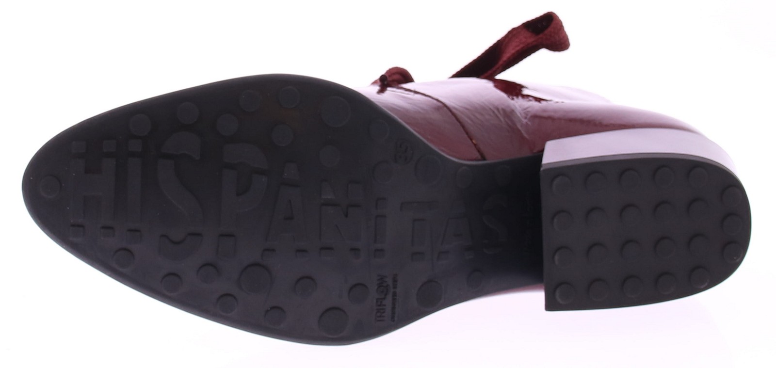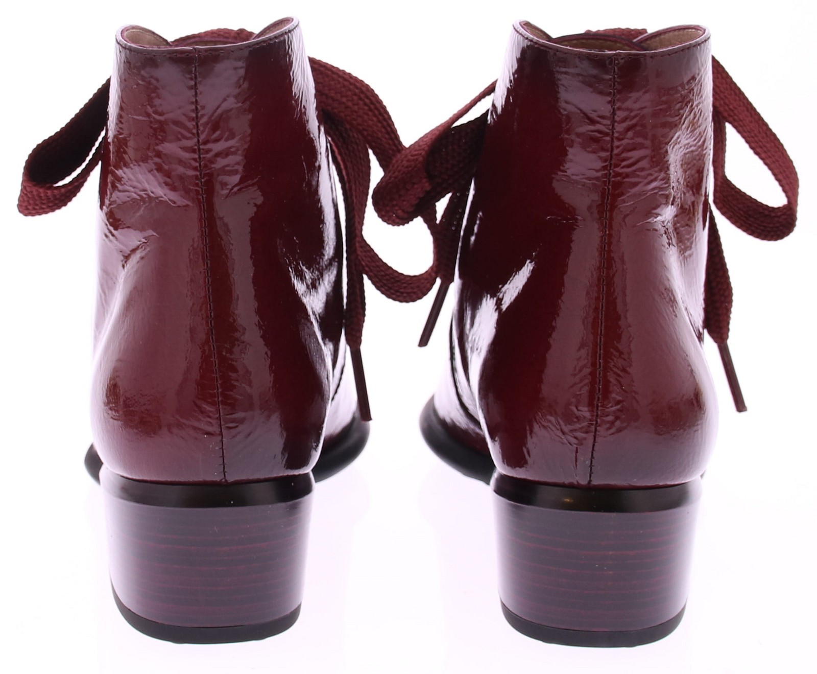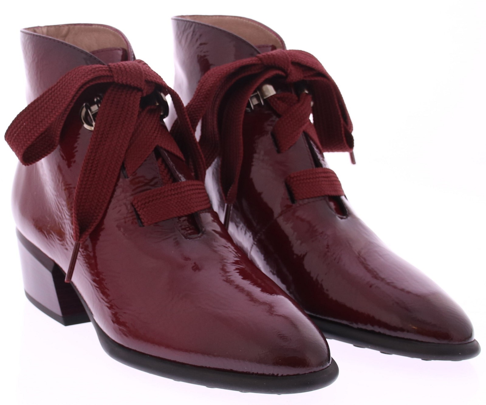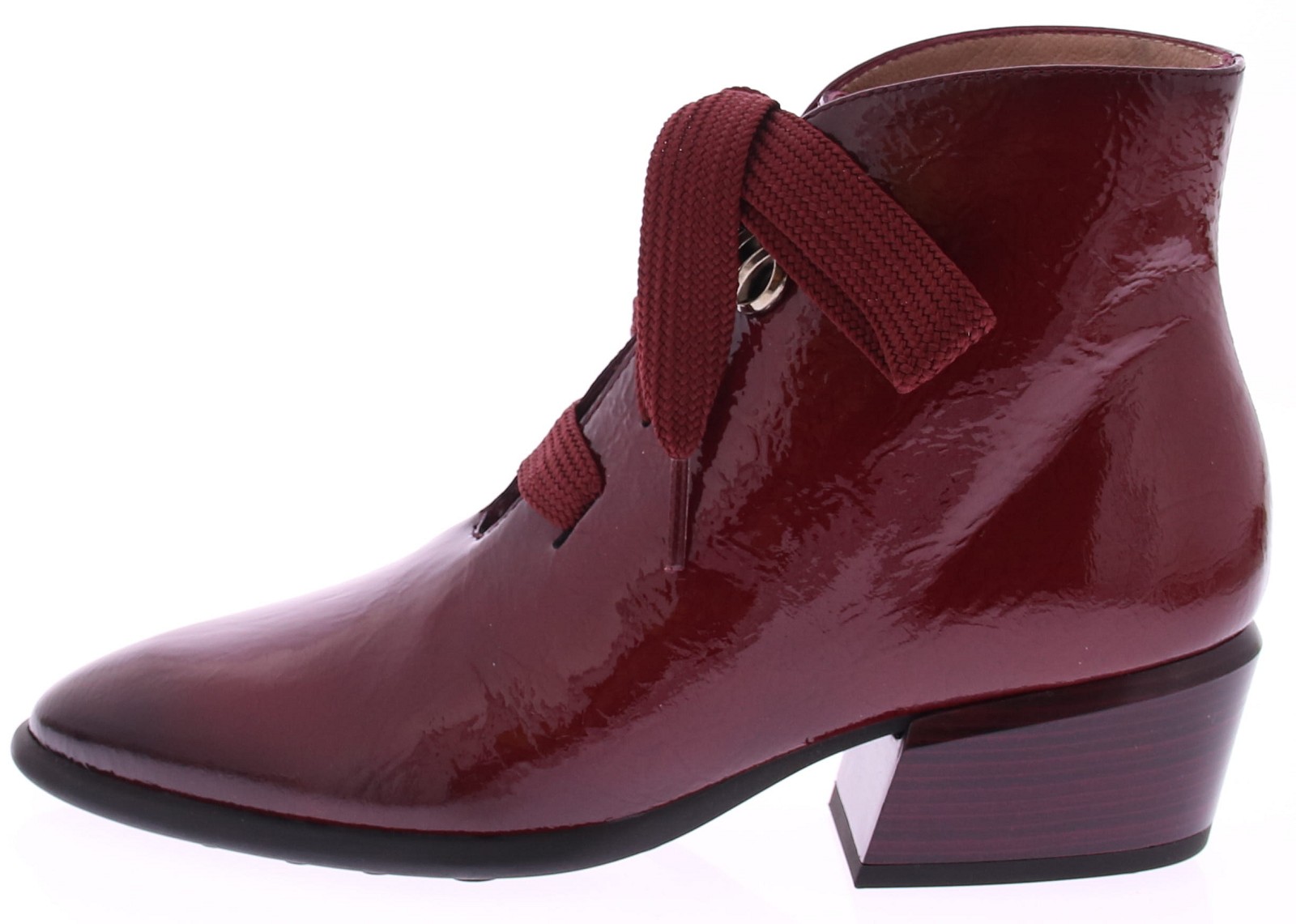 This women's short boot from Hispanitas combines modern style with a touch of classic elegance. The wine-red patent leather gives the boot a chic look, while the wide laces add a bold accent. The pointed toe and slightly angled 4cm heel create a refined, feminine look that perfectly balances elegance and comfort. Versatile enough to wear with both casual and more formal outfits, this boot offers all-day comfort. The sturdy heel provides stability, while the patent leather gives the boot a timeless charm.