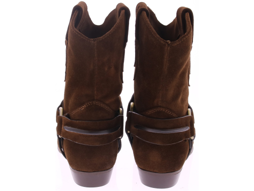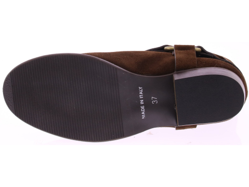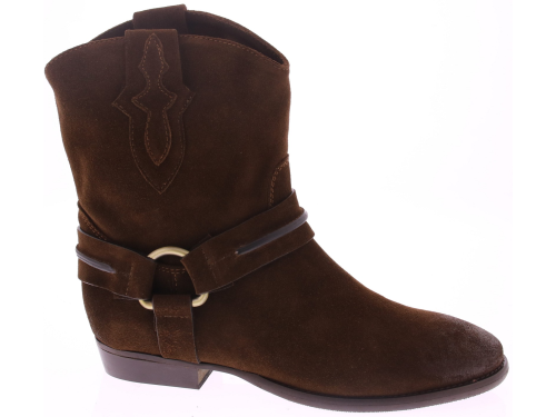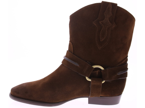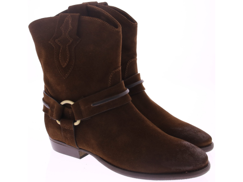 Mid-brown suede short women's boot from Julie Dee MW534. This rugged yet elegant gaucho-style ankle boot has no zipper, giving it an even more casual look. A suede strap with stitched seams and a matte gold-colored ring wraps around the ankle. The last is oval, and the heel is 2 cm.