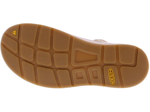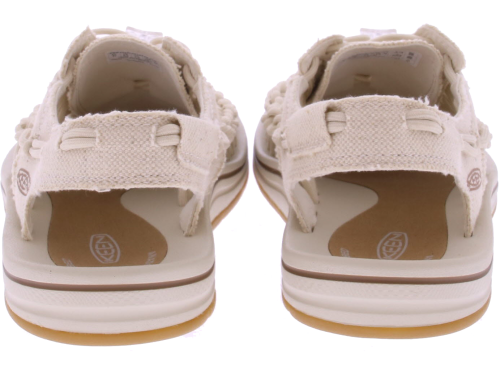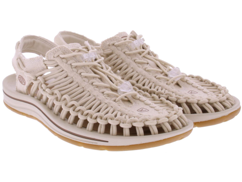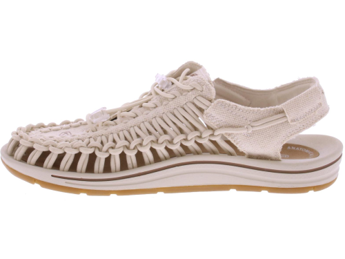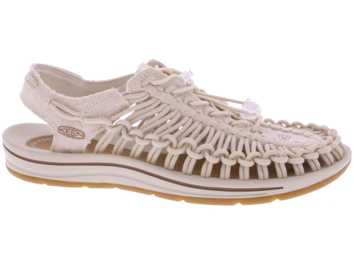 Cream-colored men's sandal from Keen. This sandal offers the perfect blend of the support and protection of a closed shoe and the airiness of a sandal. The airy weave with free-moving cords, combined with the elastic drawstring closure, conforms perfectly to the foot without pinching. The cords are made with recycled plastic. The heel strap is microfiber with a breathable microfiber lining. The lightweight midsole and non-slip rubber outsole with razor-sharp sipes provide comfortable cushioning and excellent grip. The anatomically shaped footbed is finished with a microfiber top layer.