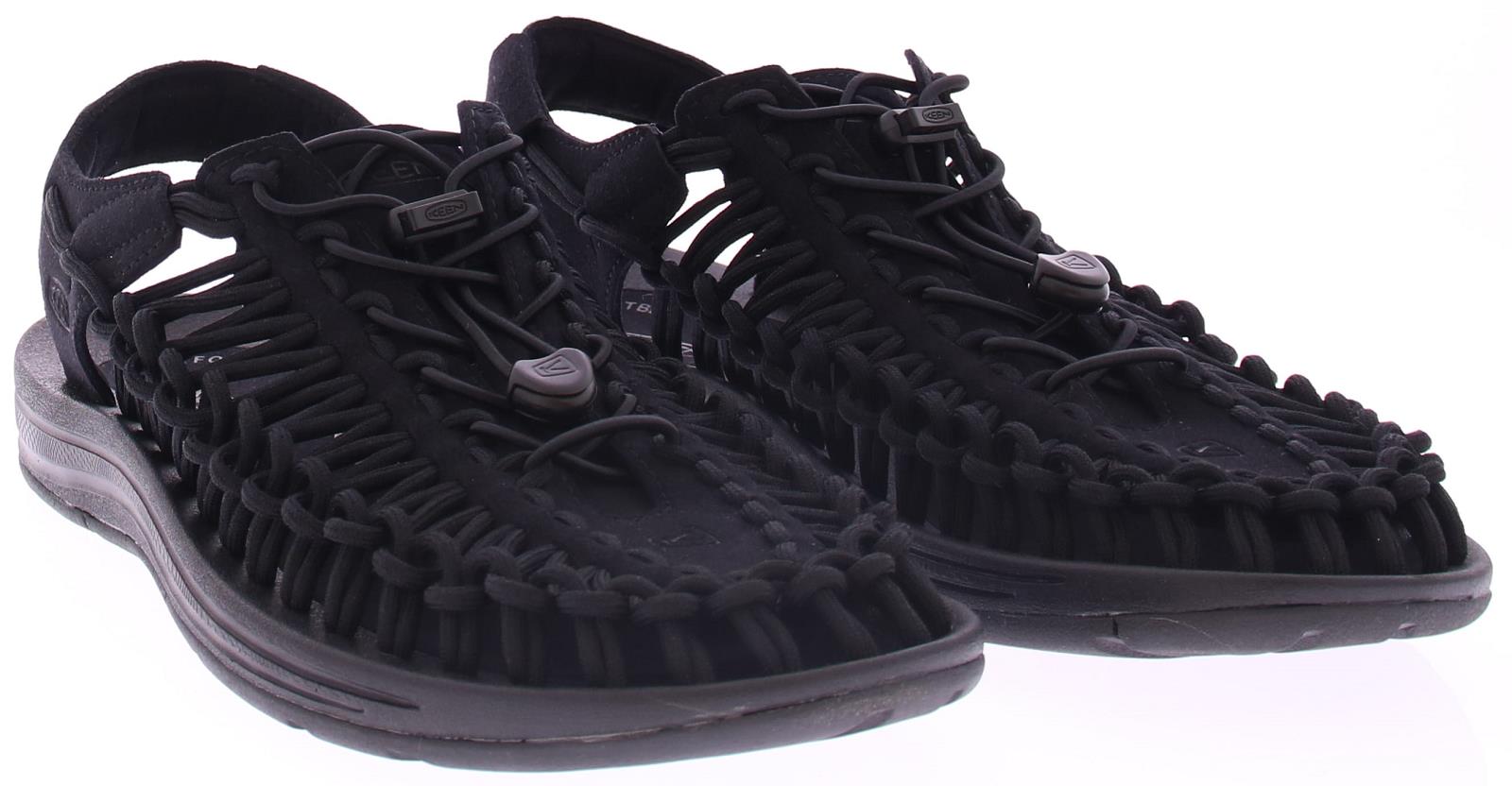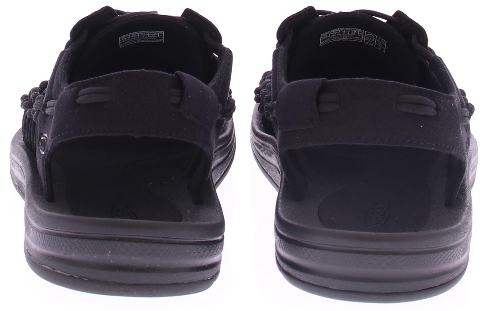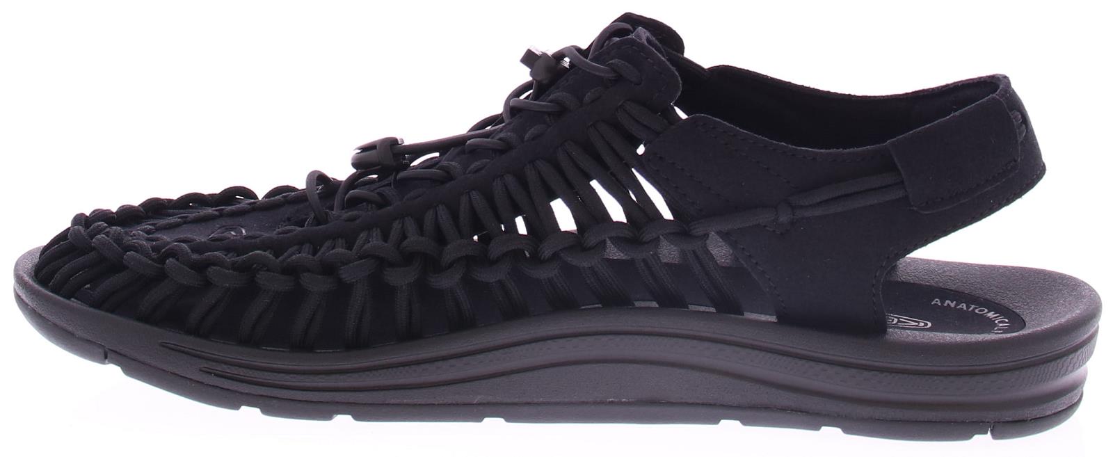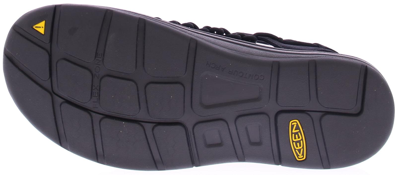 Black men's sandal from Keen. This sandal offers the perfect blend of the support and protection of a closed shoe with the airiness of a sandal. The airy weave with free-moving cords, combined with the elastic drawstring closure, allows it to conform perfectly to the foot without pinching. The cords are made with recycled plastic. The heel strap is microfiber with a breathable microfiber lining. The lightweight midsole and non-slip rubber outsole with razor-sharp sipes provide comfortable cushioning and excellent grip. The anatomically shaped footbed is finished with a microfiber top layer.