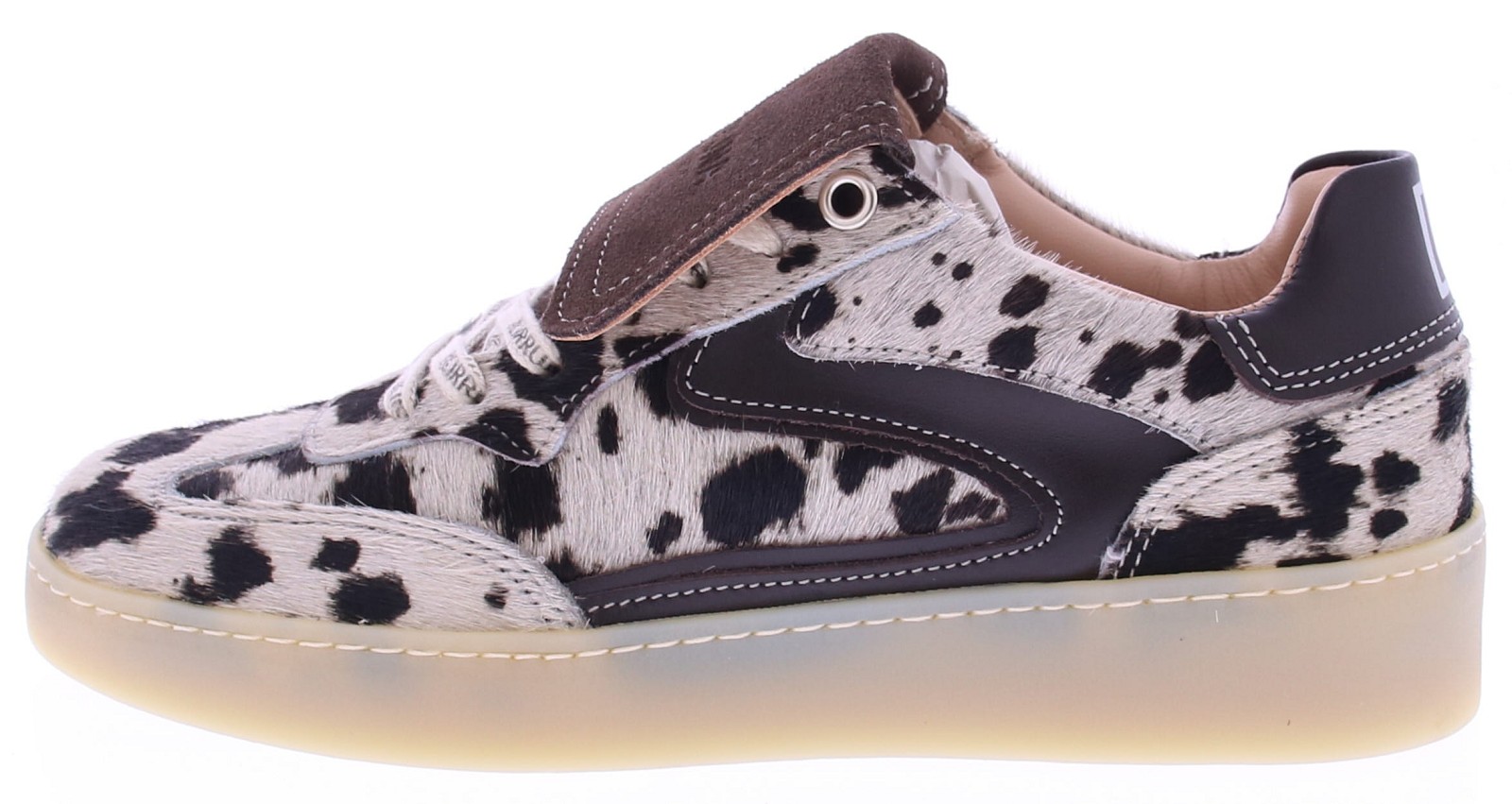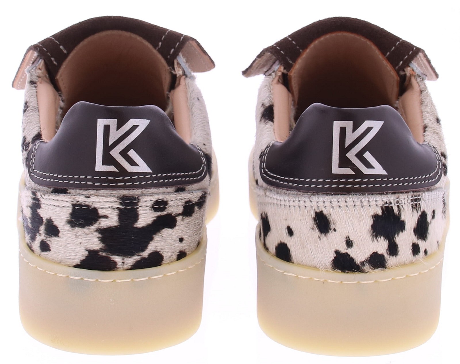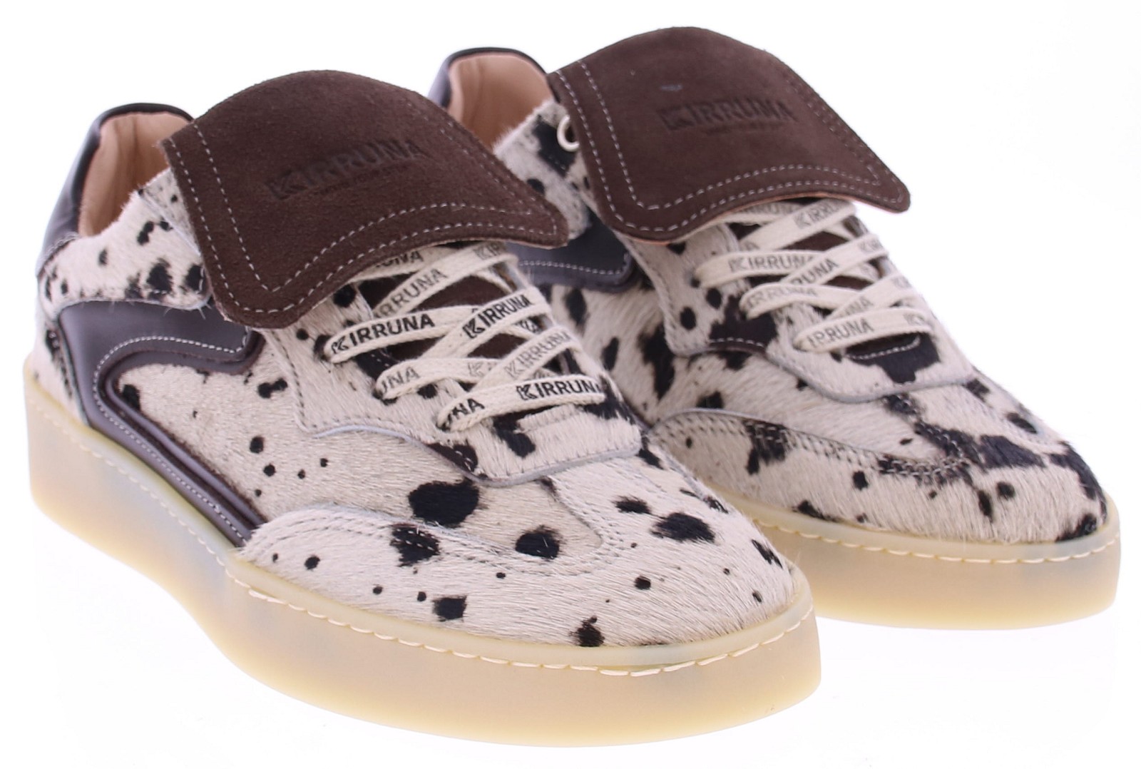 Black and white (Hairy Cow) trendy women's sneakers from Kirruna with a leopard print and stylish black leather accents. They feature a comfortable, cushioned sole and tone-on-tone laces. The footbed is removable, allowing you to easily insert your own personal insole. A distinctive shoe that pairs effortlessly with both neutral and bold outfits.
