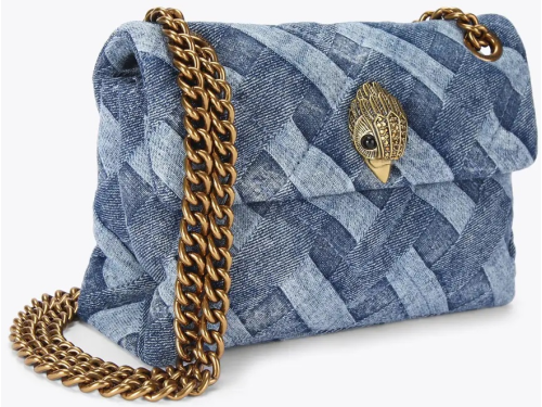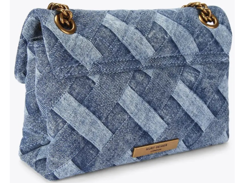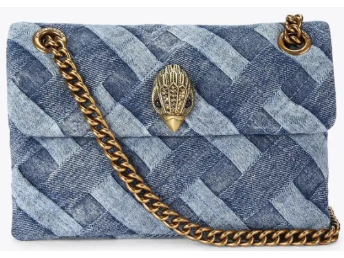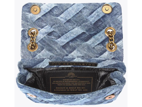 Jeans fabric women's bag by Kurt Geiger. This Mini Kensington bag is made of acid wash denim with woven motif. The antique copper eagle head is decorated with crystals. The bag closes with a magnetic click closure hidden under the flap. The aged copper shoulder strap chain has a length of 70 cm. The dimensions of the bag are 14 cm (H), 20 cm (L), 6 cm (D). The crossbody strap is 120 cm.