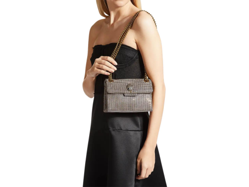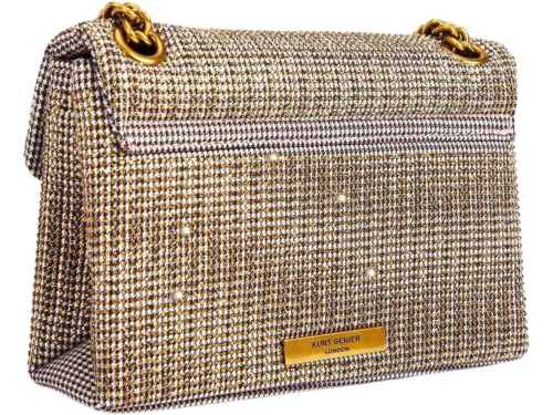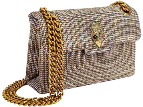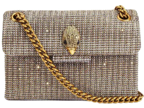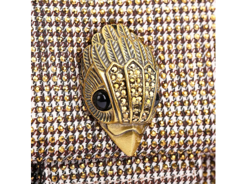 Beige fabric women's bag by Kurt Geiger. The Fabric Kensington Mini is made of a pied-de-poule fabric with copper crystals. The antique copper eagle head is decorated with opaque copper crystals and black bead eyes on the front flap. The bag closes with a duo magnetic click closure hidden under the flap. The dimensions of the bag are 14 cm (H), 20cm (L), 6cm (D). The crossbody strap has a length of 111 cm. The aged copper shoulder strap is 64 cm long.