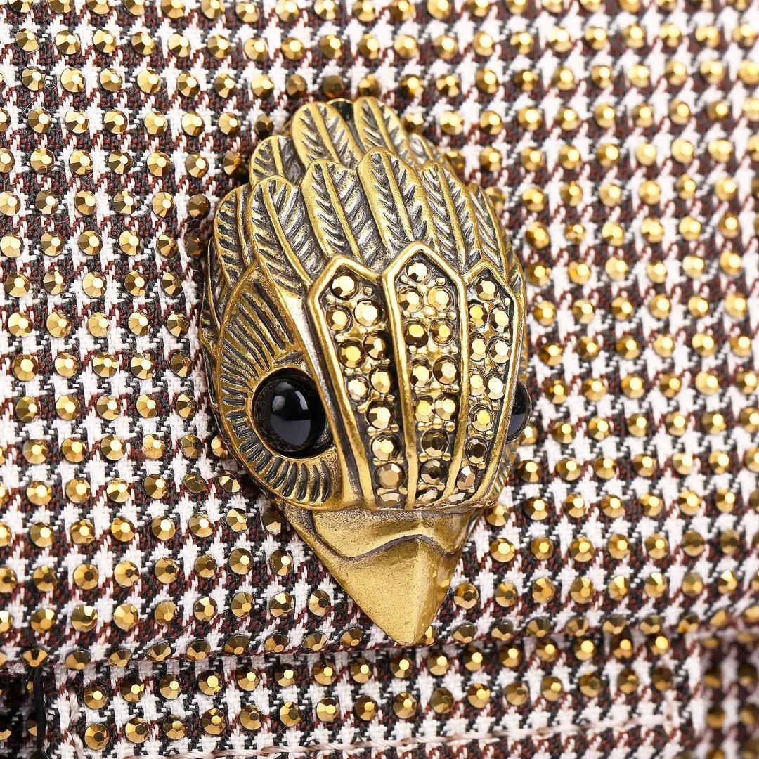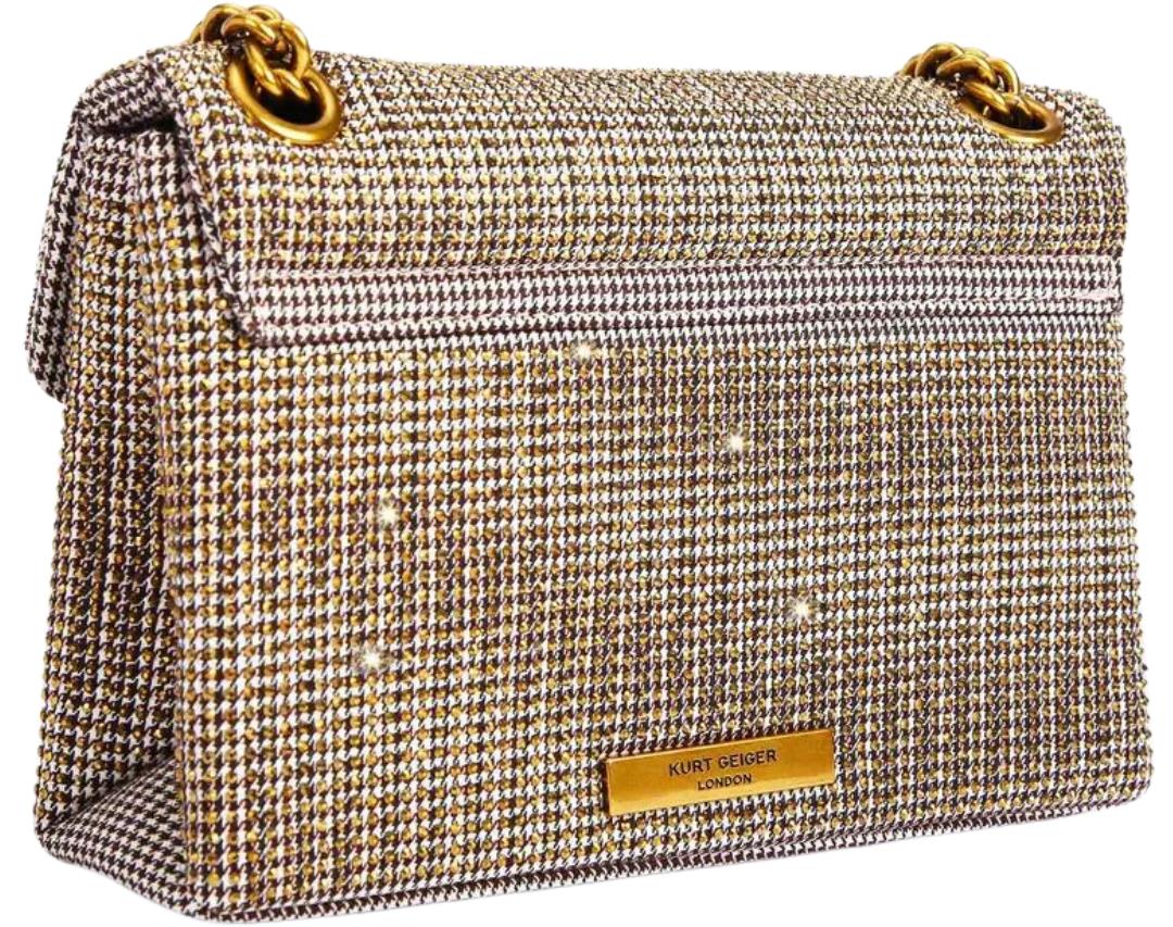 Beige fabric women's bag by Kurt Geiger. The Fabric Kensington Mini is made of a pied-de-poule fabric with copper crystals. The antique copper eagle head is decorated with opaque copper crystals and black bead eyes on the front flap. The bag closes with a duo magnetic click closure hidden under the flap. The dimensions of the bag are 14 cm (H), 20cm (L), 6cm (D). The crossbody strap has a length of 111 cm. The aged copper shoulder strap is 64 cm long.