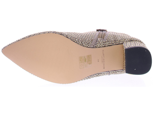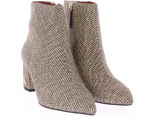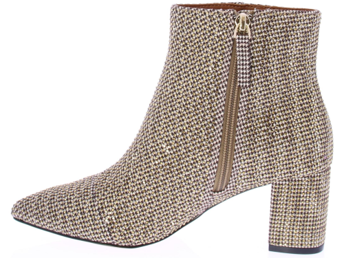 Beige women's fabric boot from Kurt Geiger. The Burlington ankle boot is made of beige houndstooth fabric with opaque gold crystals. The 6 cm block heel features the Kurt Geiger logo.
