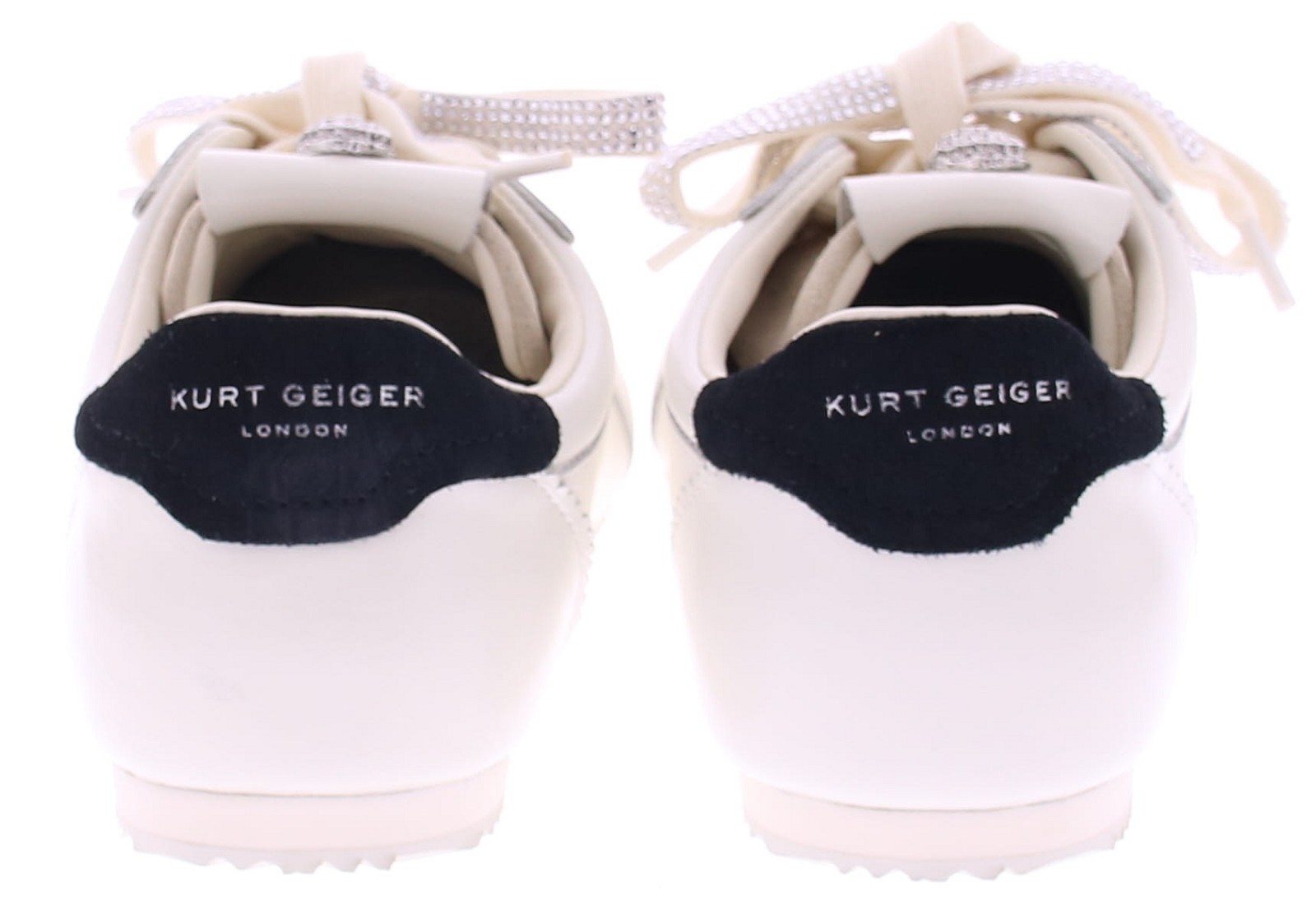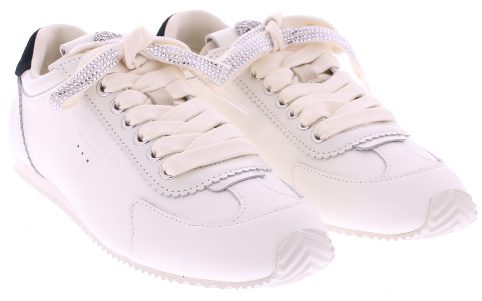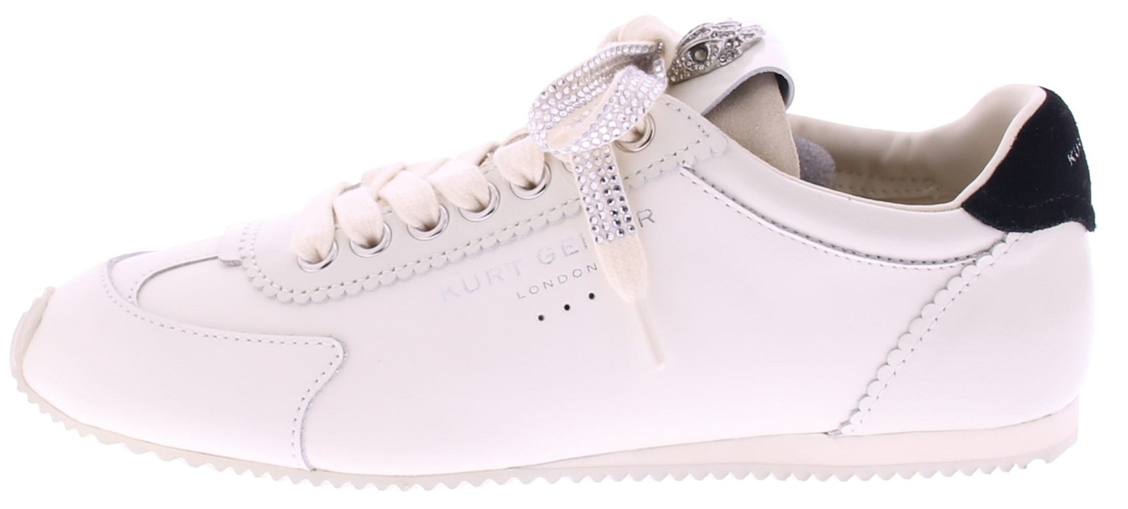 White leather women's sneakers from Kurt Geiger. These Islington sneakers are made of white leather with a black accent on the heel. Silver brand logos are visible on the side and heel counter. The tongue features the familiar antique silver eagle head with transparent crystals. The lining is fabric, and the footbed is leather. These sneakers run one size smaller than usual!