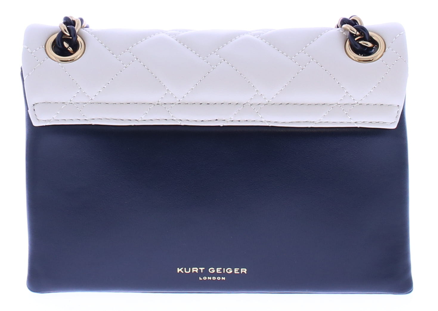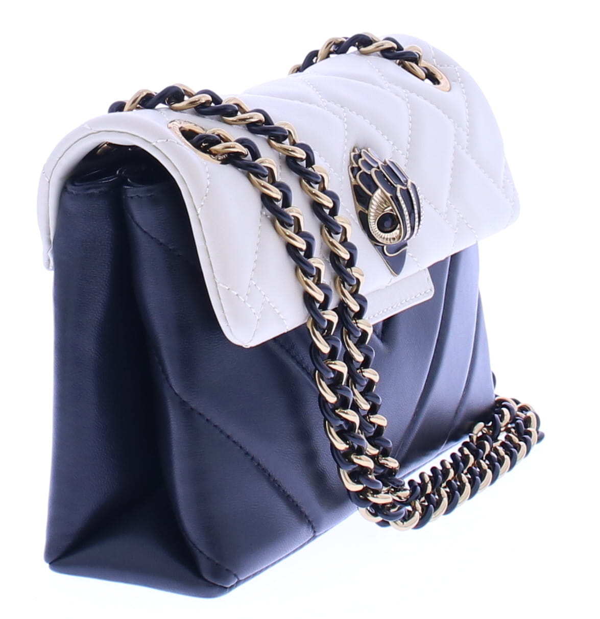 Black and white leather women's bag by Kurt Geiger. This leather bag features the iconic eagle head on the front flap with black crystals and closes with a duo magnet hidden under the flap. The bag has an elegant and timeless look that's perfect for both everyday use and special occasions.