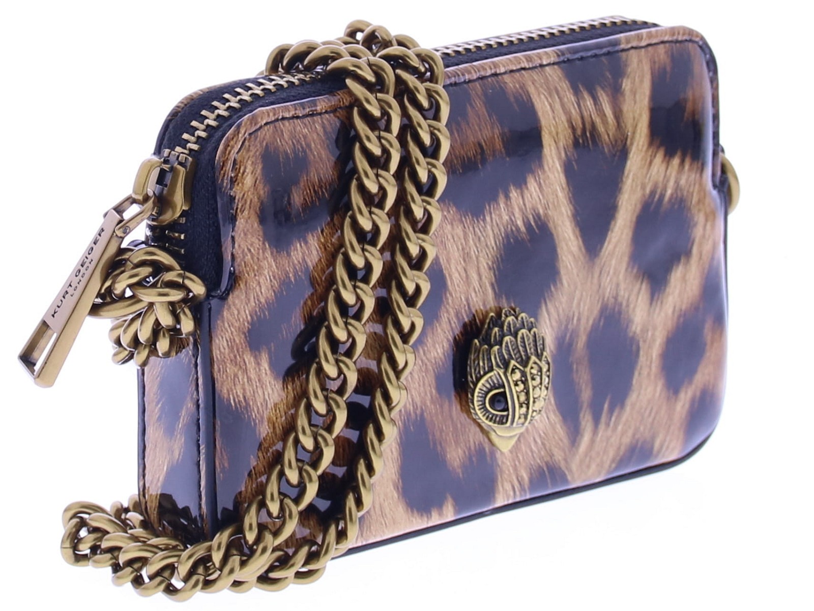 Kurt Geiger women's fabric camera bag. This Mini Kensington bag is made of leopard-print fabric quilted with gold thread. The antique brass eagle head is adorned with crystals. The bag closes with a zipper. The bag measures 7 cm (H), 10 cm (L), and 2 cm (D). The antique gold crossbody chain is 123 cm.