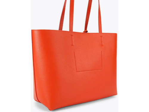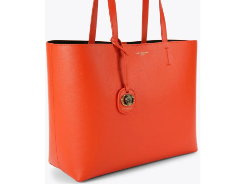 The Drench Chelsea Shopping Bag in orange is crafted from lightly textured leather. It features subtle embossed branding on the front of the bag and a crystal-embellished oval border with a central eagle head on the luggage tag. Bag dimensions: 28 cm (H), 36 cm (L), 35 cm (D). Strap length: 60 cm. Internal compartment: 13 cm (H), 19 cm (L), 2.5 cm (D).