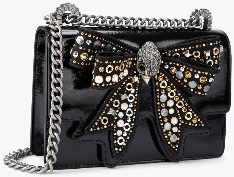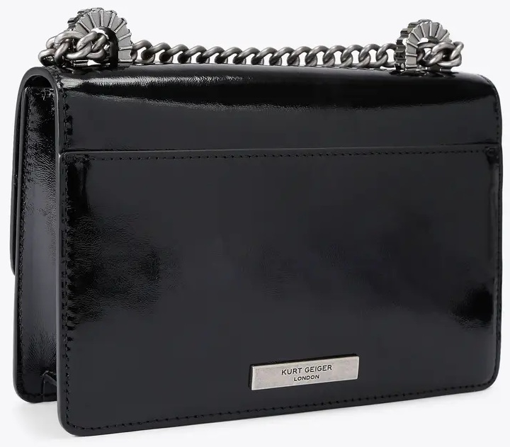 The Small Shoreditch Crossbody is crafted from black patent leather. The front flap features a studded bow with a silver eagle head in the center. The bag closes with two magnetic snaps hidden under the front flap. The silver chain strap measures 127 cm. Bag dimensions: 13.5 cm (H), 20 cm (L), and 6 cm (D).